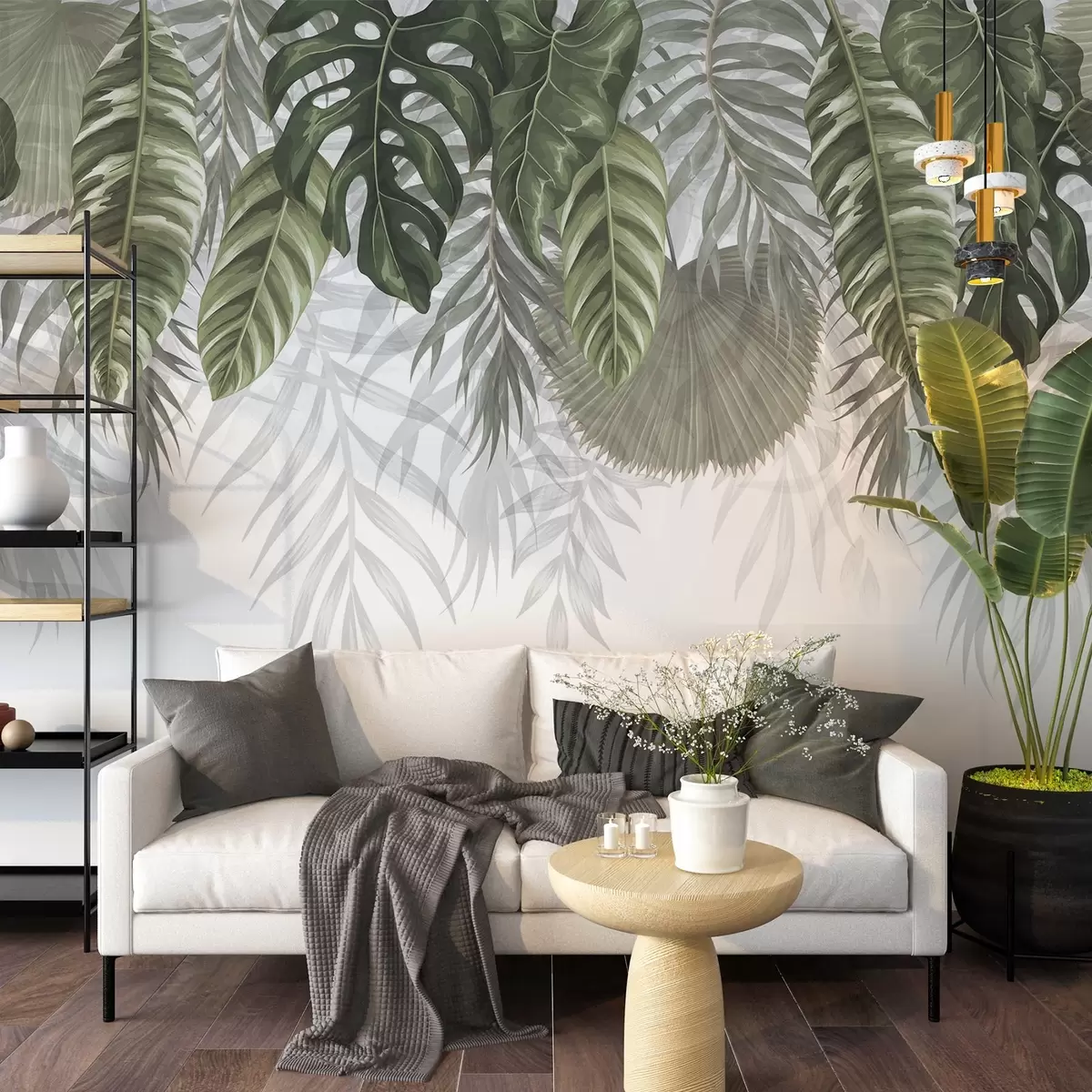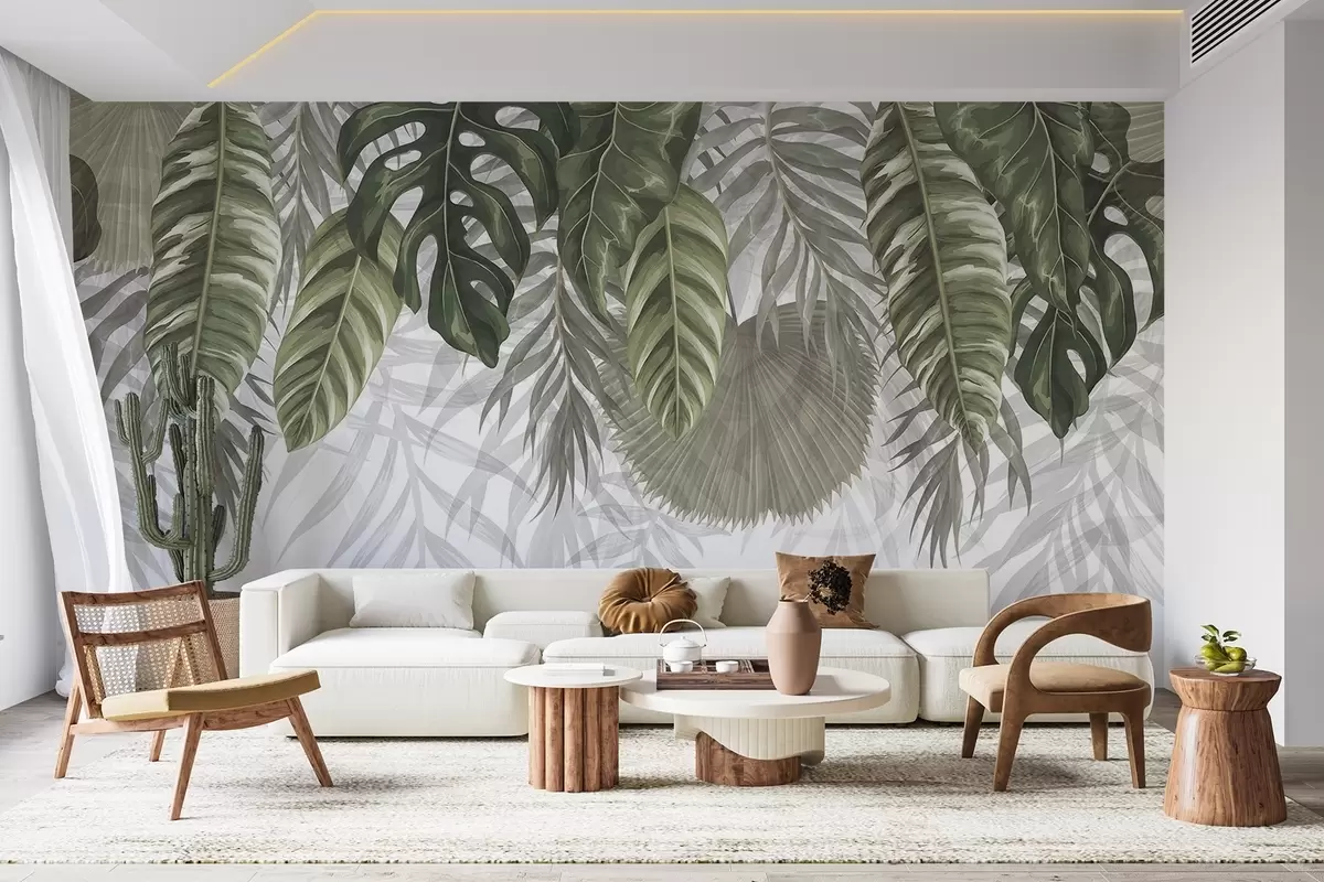 Fototapeedid Troopilised lehed roheliste toonidega, sealhulgas suured monstera lehed ja palmilehed valgel taustal Nr w08443