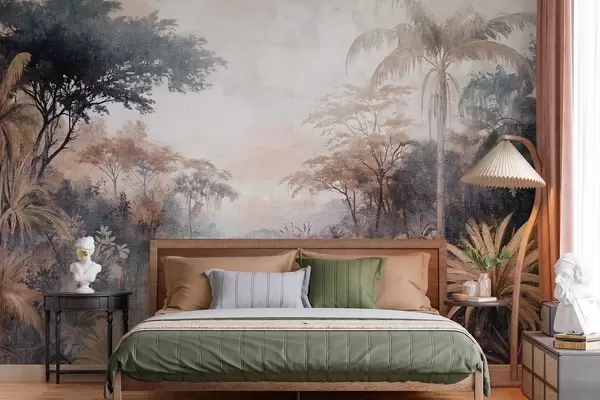 Fototapeedid Tekstuurne troopiline maastik, kus on rahulik jõgi, mida ümbritsevad lopsakad palmid, põõsad ja muud lehestikud Nr w08460