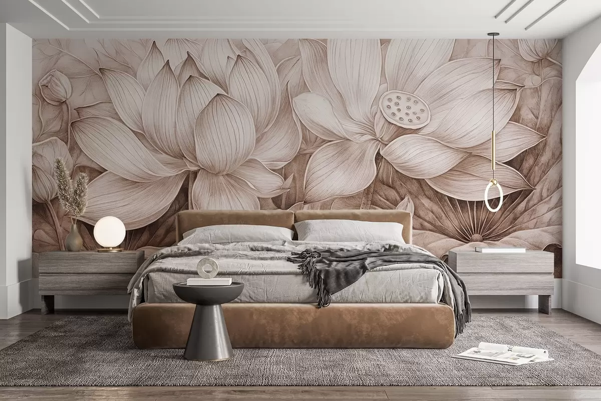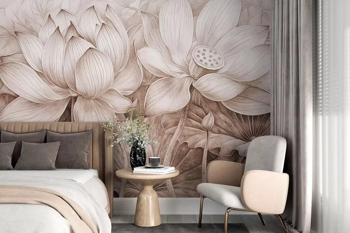Fototapeedid Mitmed üksikasjalikud tekstuuriga suured beežid lootoslilled koos pruunide lehtede ja varrega heledal taustal Nr w08465v1