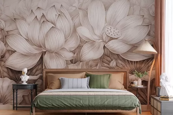 Fototapeedid Mitmed üksikasjalikud tekstuuriga suured beežid lootoslilled koos pruunide lehtede ja varrega heledal taustal Nr w08465v1