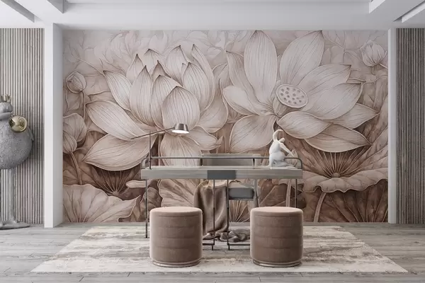 Fototapeedid Mitmed üksikasjalikud tekstuuriga suured beežid lootoslilled koos pruunide lehtede ja varrega heledal taustal Nr w08465v1