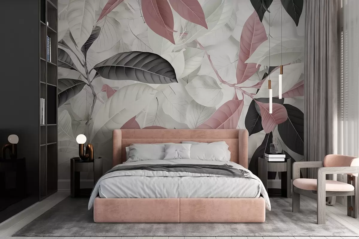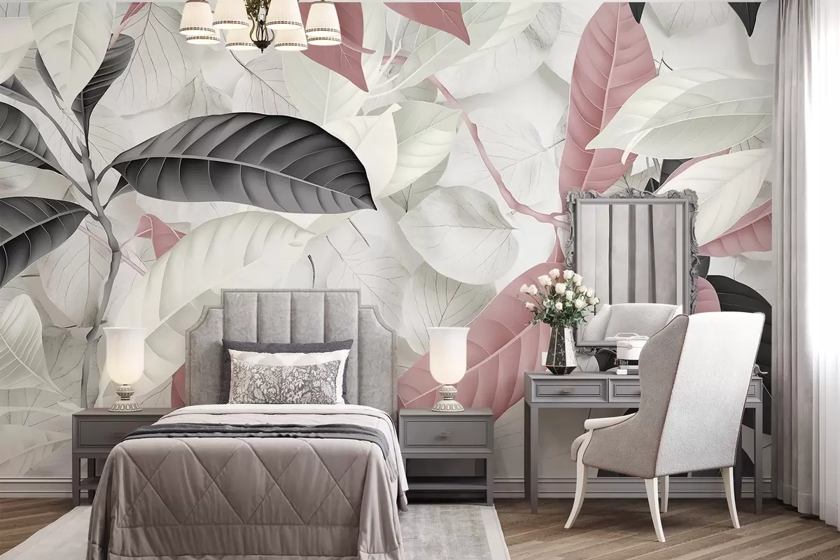 Fototapeedid Roosa ja halli lehe suures formaadis trükis heledate lehtede tekstuuriga taustal, mis loob lopsaka troopilise meeleolu Nr w08468