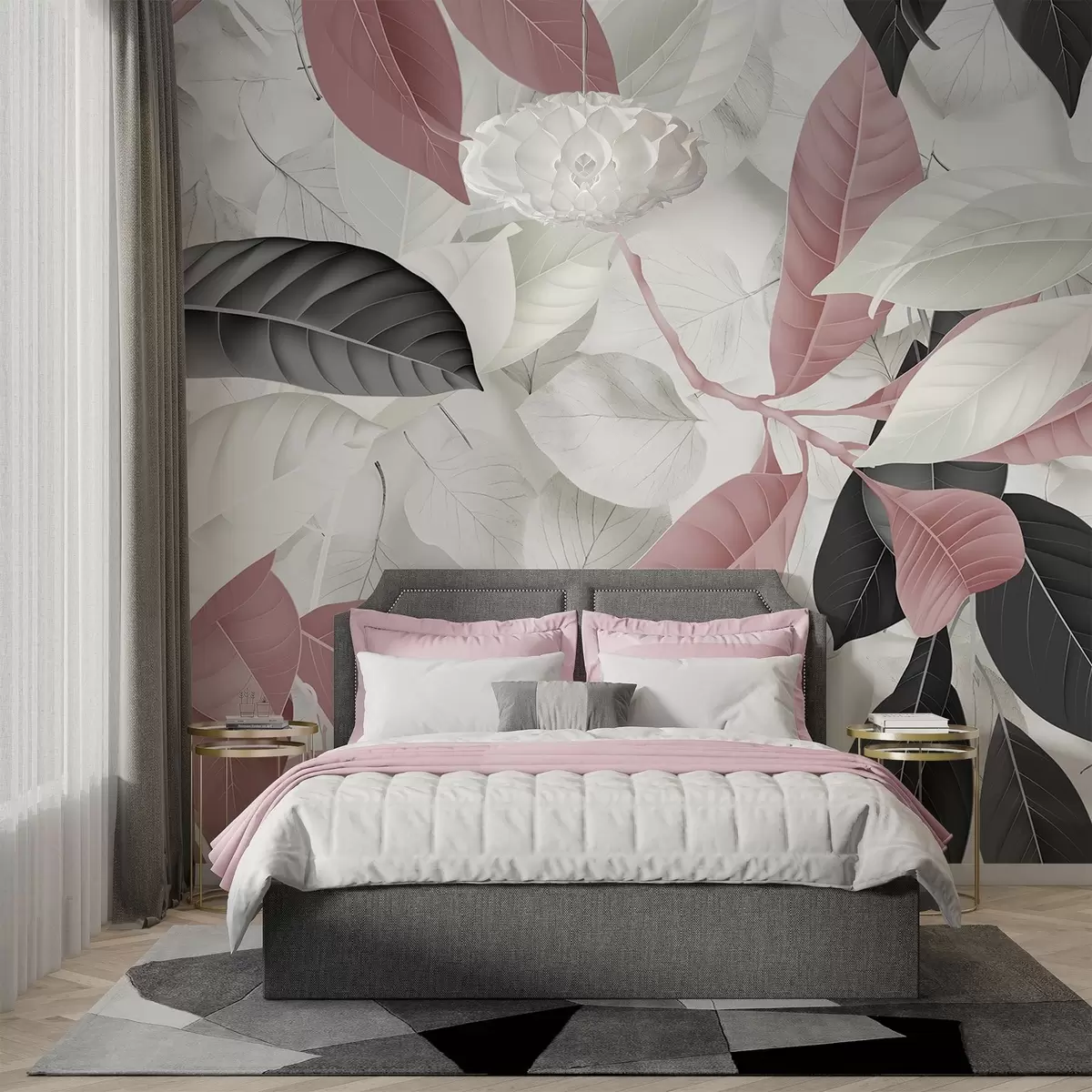 Fototapeedid Roosa ja halli lehe suures formaadis trükis heledate lehtede tekstuuriga taustal, mis loob lopsaka troopilise meeleolu Nr w08468