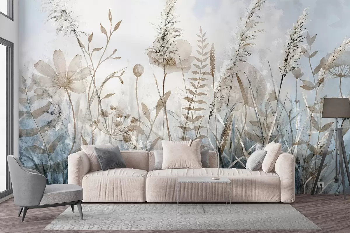 Fototapeedid Kõrge rohu, looduslike lehtede ja taimede pehme, vildakate tekstuuridega väli uduse, pilvise taeva taustal Nr w08472