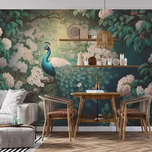 Fototapeedid Kaunis paabulind okstel väikeste lillede vahel Nr w08475