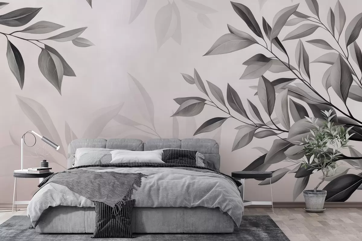 Fototapeedid Tumesinised oksad koos lehtedega halli taustaga Nr w08499v1