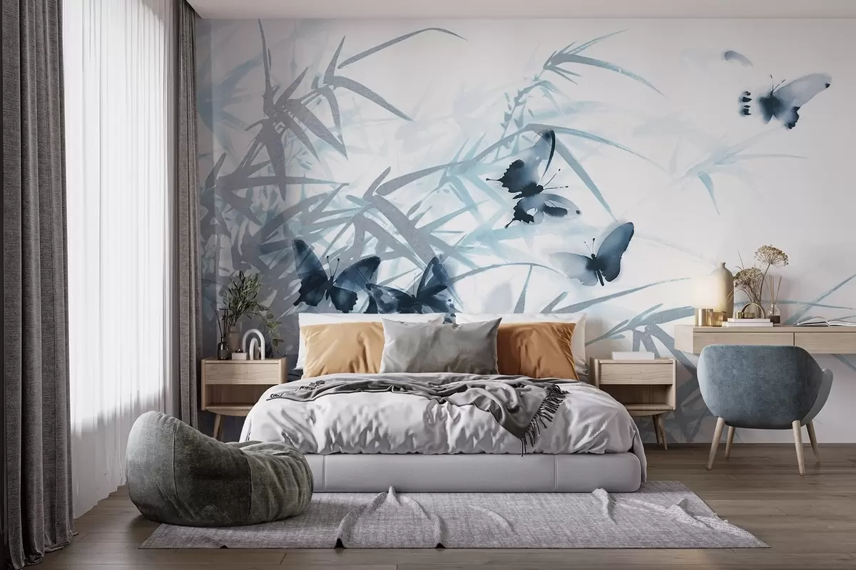 Fototapeedid Tekstuursed bambuslehed ja -varred koos läbipaistvate tiibadega lendavate siniste liblikatega Nr w08524