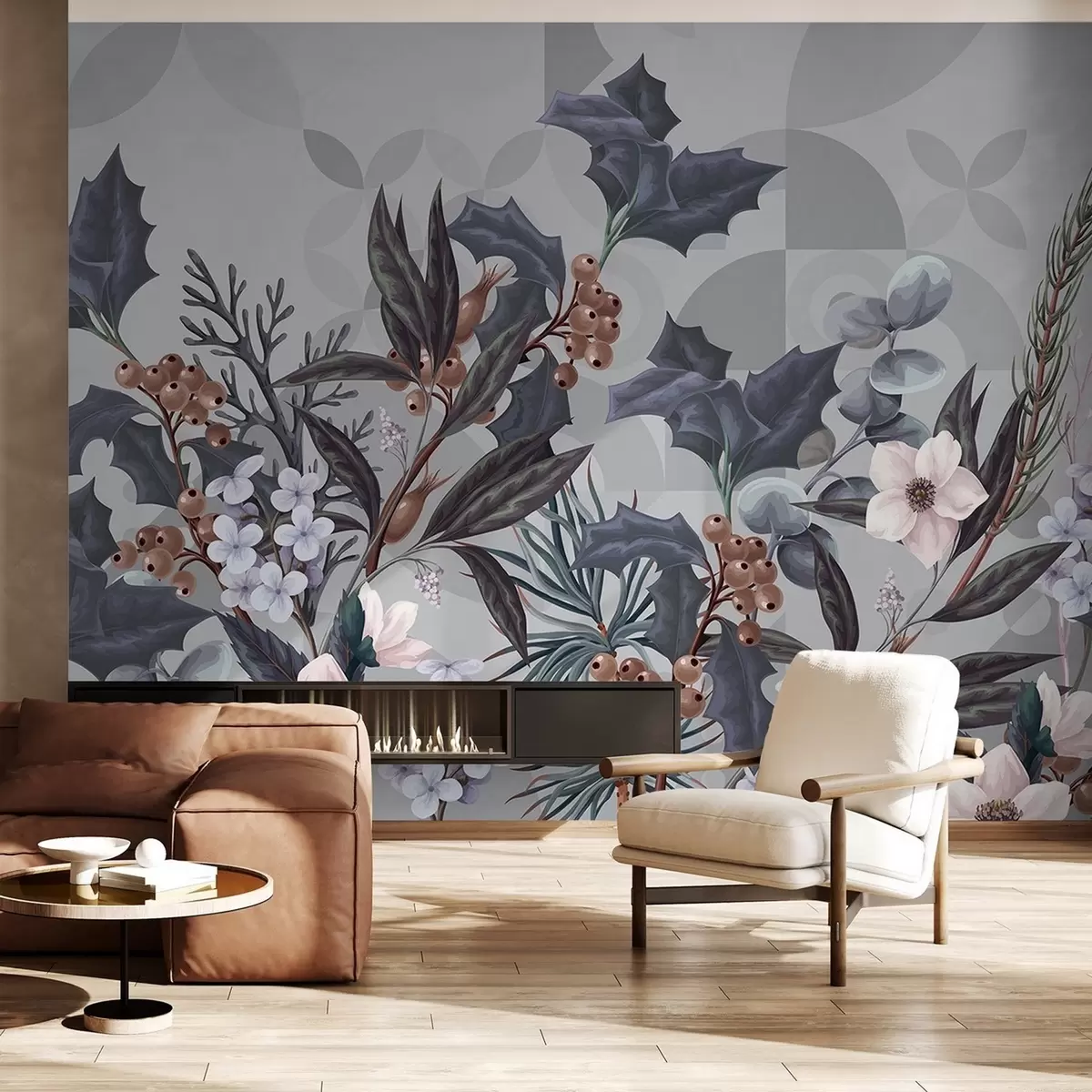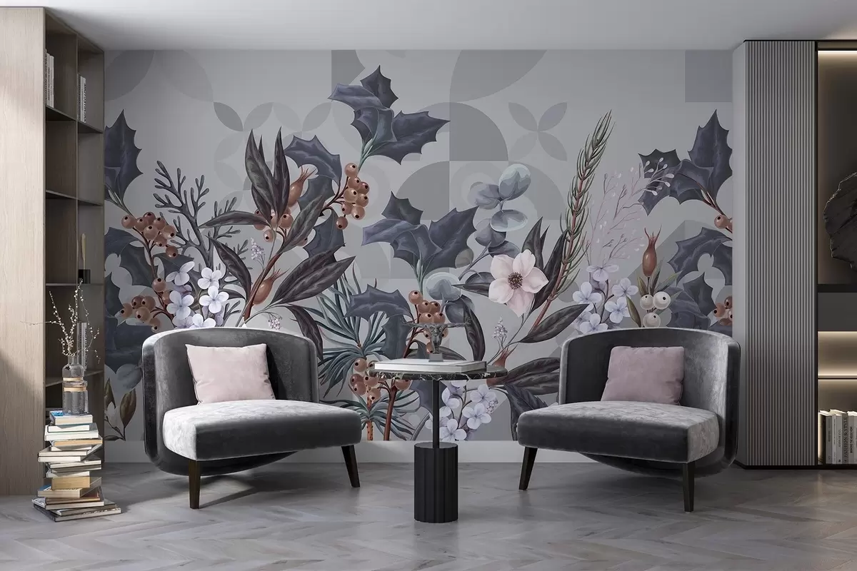 Fototapeedid Suurte tumedate lehtede, lillede ja marjadega lilleseade vaikselt hallil geomeetrilisel abstraktsel taustal Nr w08525