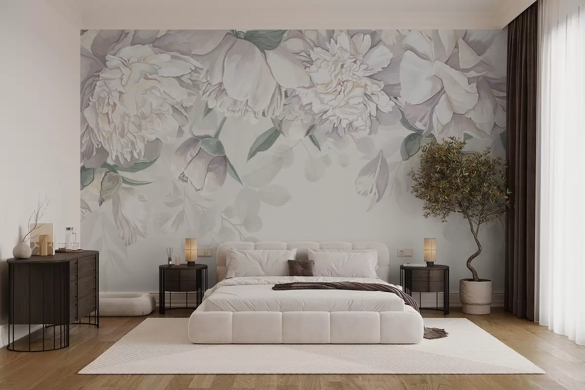 Fototapeedid Õrnad valged ja roosad pastelsed pojengid koos roheliste lehtedega, mis on paigutatud pehmele, romantilisele lillefoonile Nr w08577