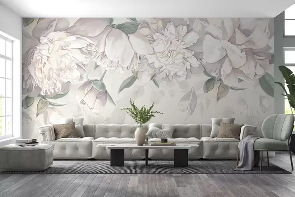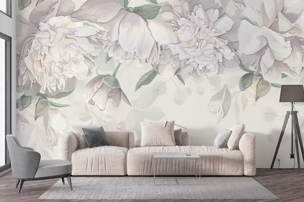 Fototapeedid Õrnad valged ja roosad pastelsed pojengid koos roheliste lehtedega, mis on paigutatud pehmele, romantilisele lillefoonile Nr w08577