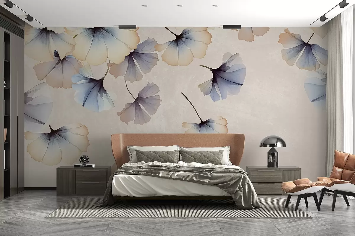 Fototapeedid Pastelsinise ja beeži värvi ginkgo lehed, mille õrnad kroonlehed hõljuvad õhus tekstuurilisel taustal Nr w08578