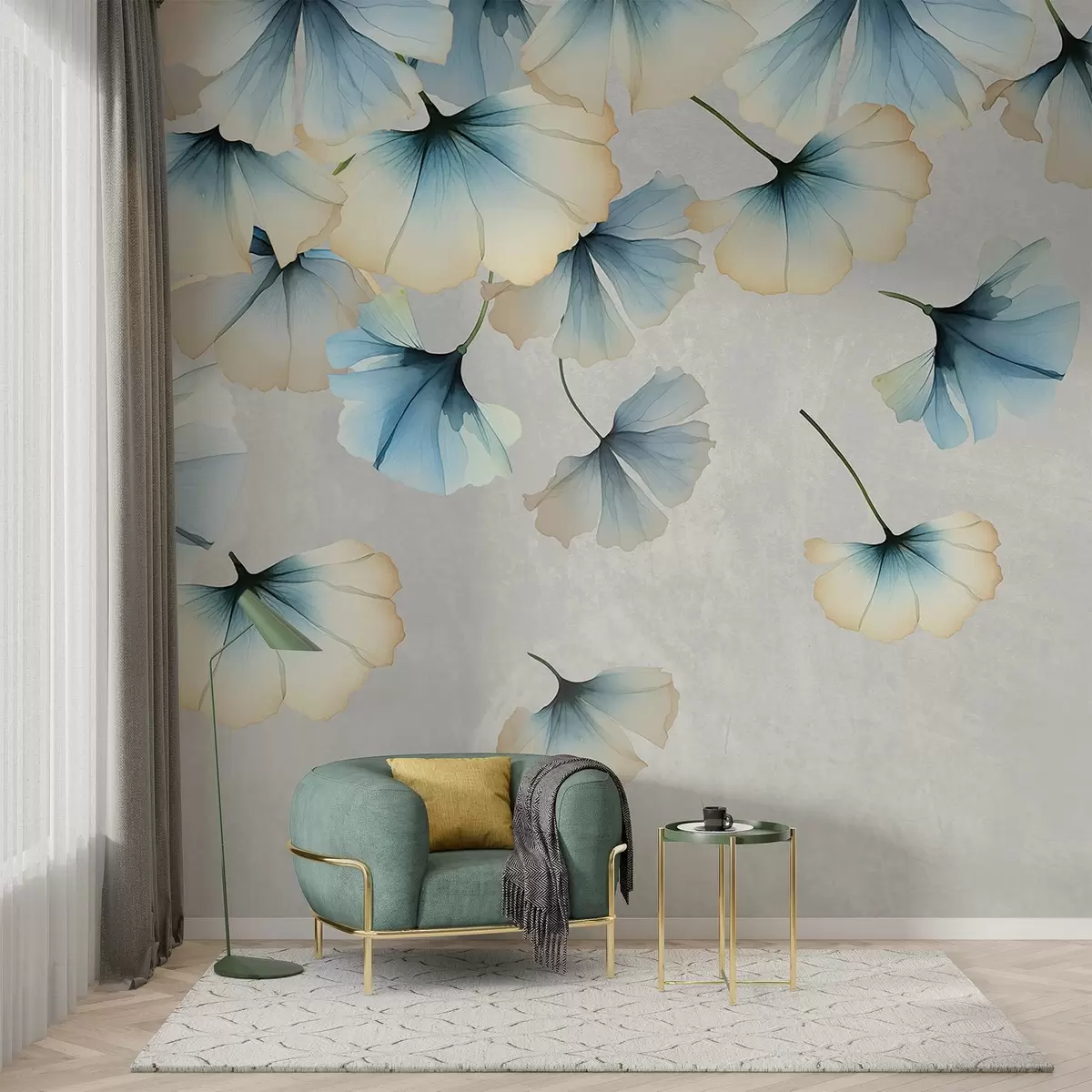 Fototapeedid Pastelsiniste ja kollaste ginkgo lehtede õrnade kroonlehtedega, mis hõljuvad õhus tekstuurilisel taustal Nr w08578v1