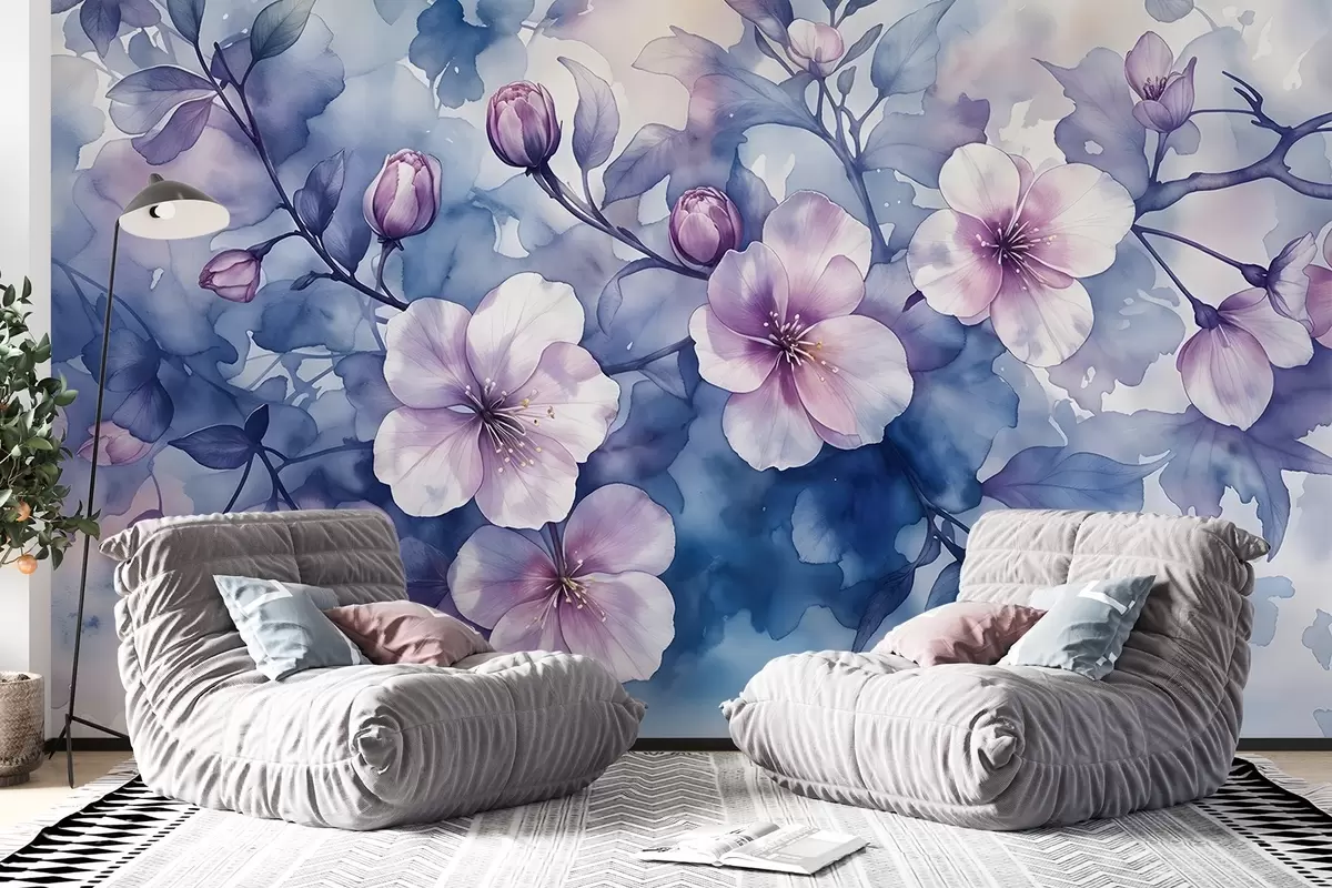 Fototapeedid Õrnad akvarelliimitatsiooniga roosa ja lillad lilled pehmete, hägustatud kroonlehtedega sinise pritsme taustal Nr w08582