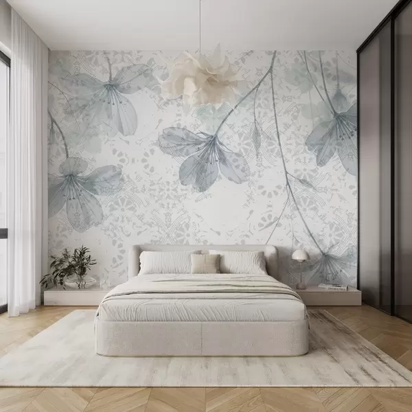 Fototapeedid Pikkade varte ja kroonlehtedega õrnad sinised ja valged lilled pehmel, hägusel taustal Nr w08588