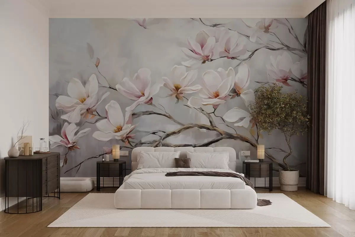 Fototapeedid Õrnad roosad magnoolialilled õitsevad paljaste puude okstel pehmel, udusel taustal Nr w08589