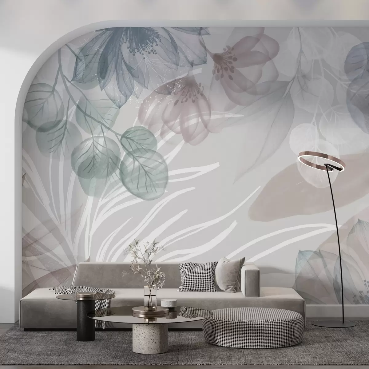Fototapeedid Pastellvärvi lilleline trükis, millel on läbipaistvad suured abstraktsed lilled ja lehed halli, roosa ja rohelise tooniga Nr w08600