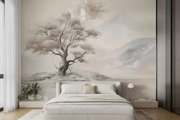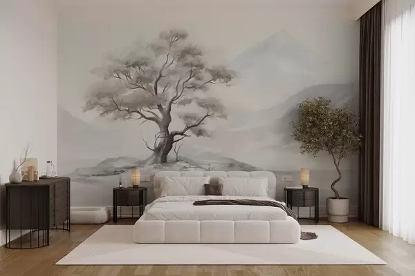 Fototapeedid Minimalistlik joonis üksildasest, väändunud puust üksildasel, kivisel maastikul, mille taustal on mäed Nr w08604