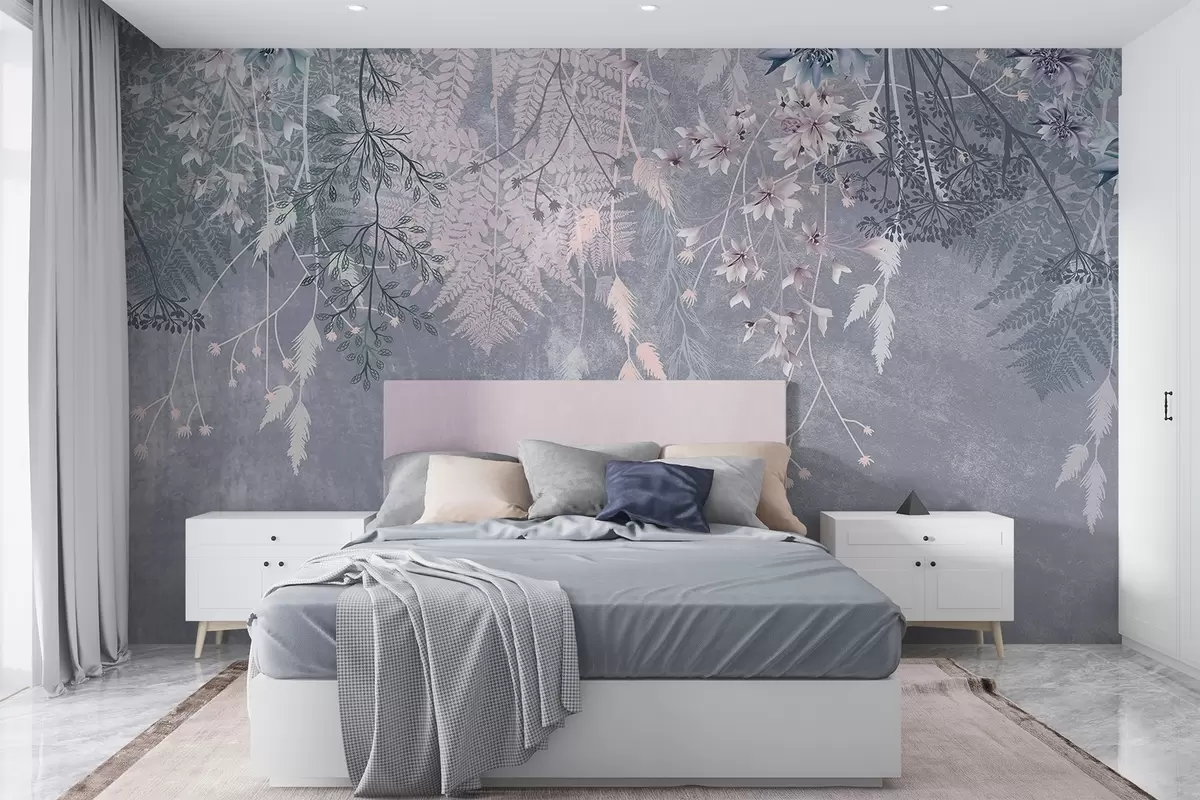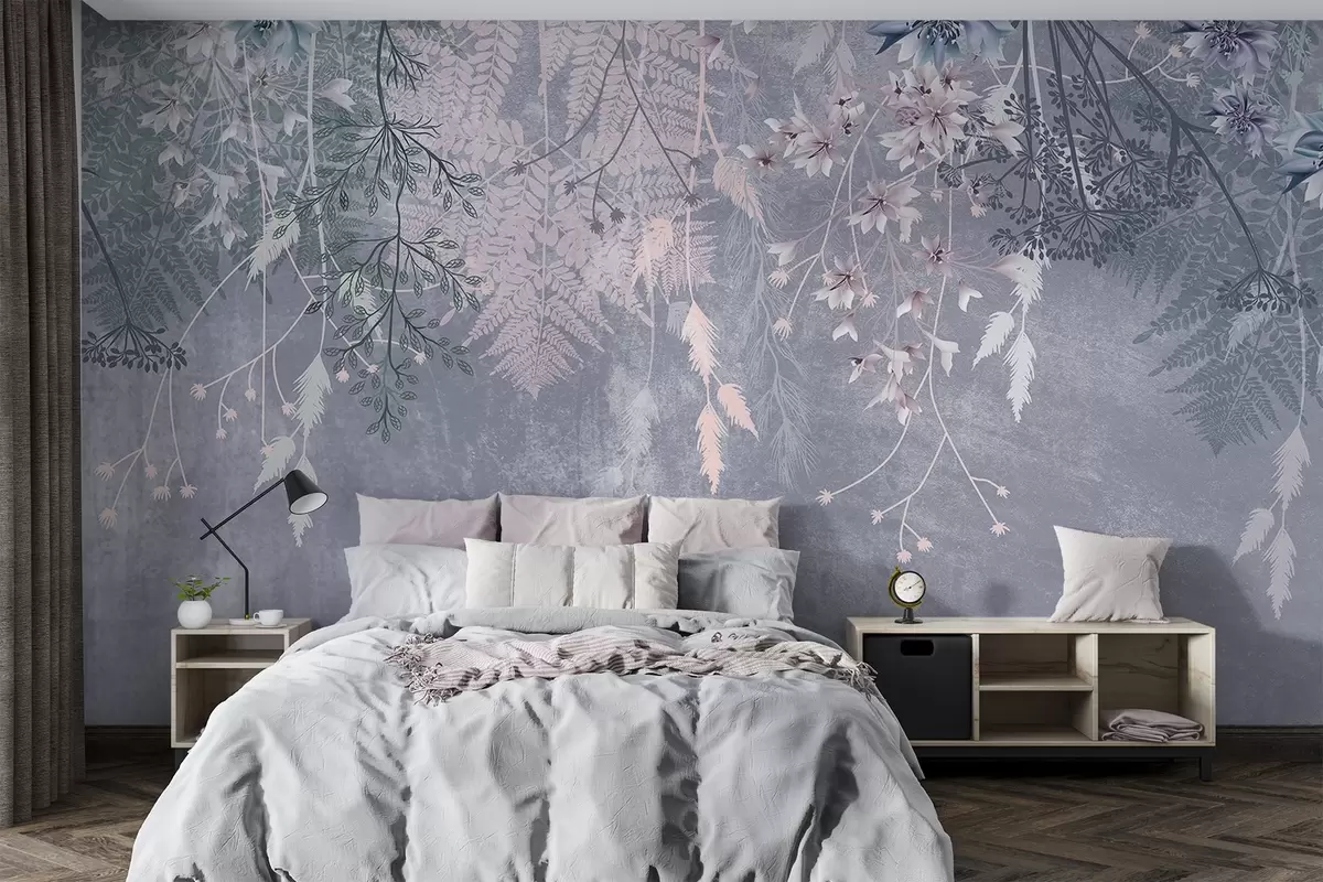 Fototapeedid Unenäoline, õrn, vildakad taimed, õisikud ja lilled sinistes pastelsetes värvides udusel, tekstuursel taustal Nr w08606