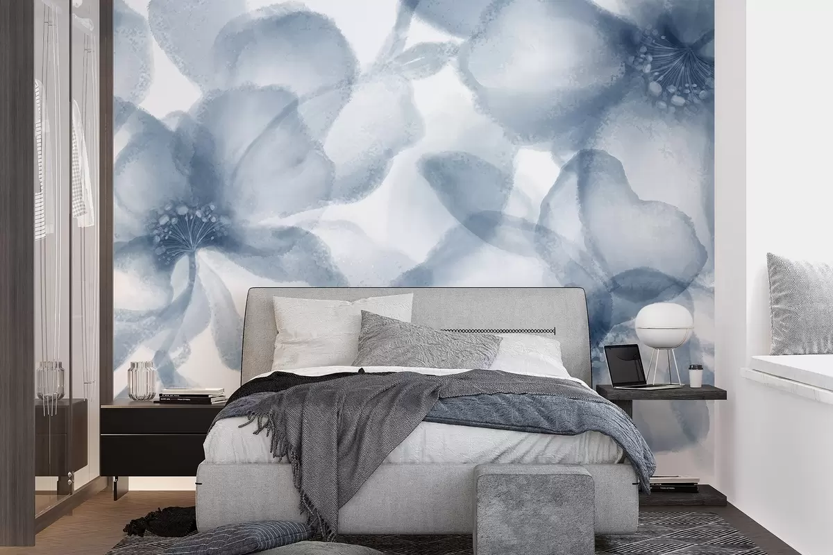 Fototapeedid Pehme, hägune abstraktne sinine lill, mis loob rahuliku ja rahustava lilleprindi Nr w08607