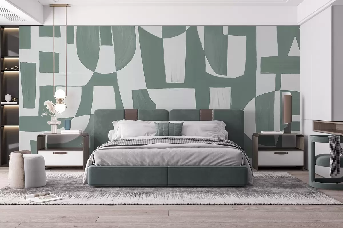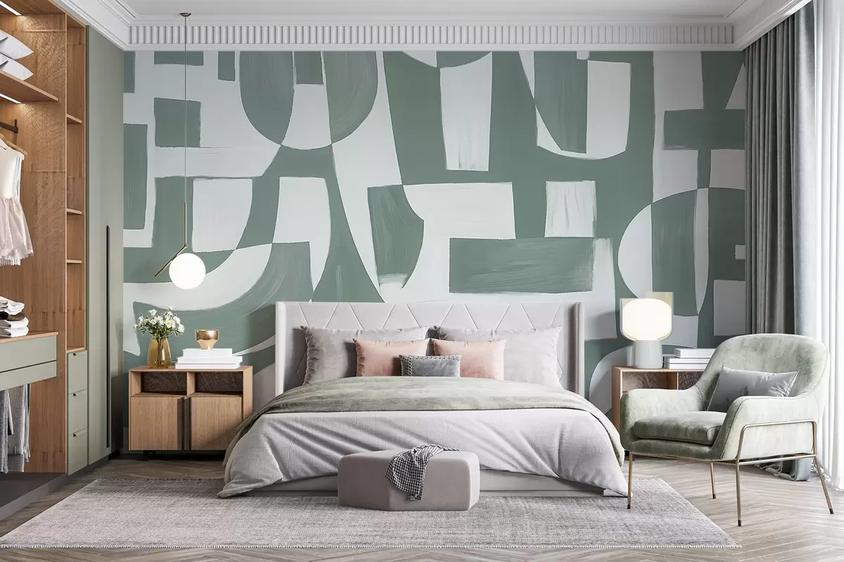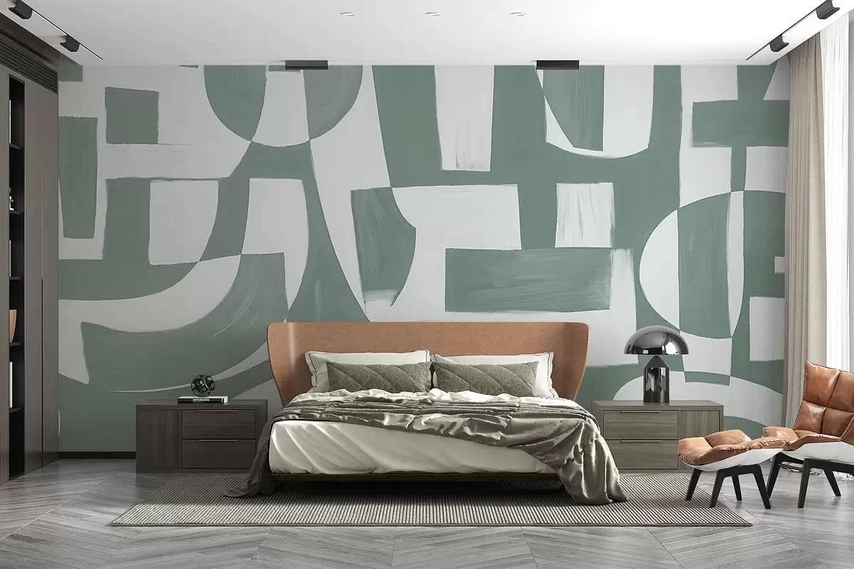 Fototapeedid Abstraktsed rohelised ja valged geomeetrilised kujundid ja mustrid, mis loovad visuaalselt silmatorkava ja dünaamilise kompositsiooni Nr w08608v1