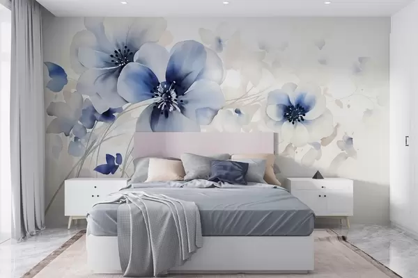 Fototapeedid Õrnad akvarellilaadsed sinised ja valged lilled pehmete kroonlehtedega ja hägune taust Nr w08610