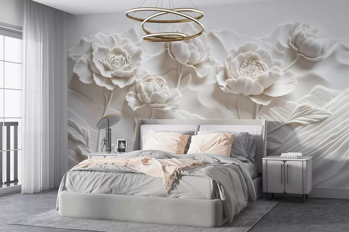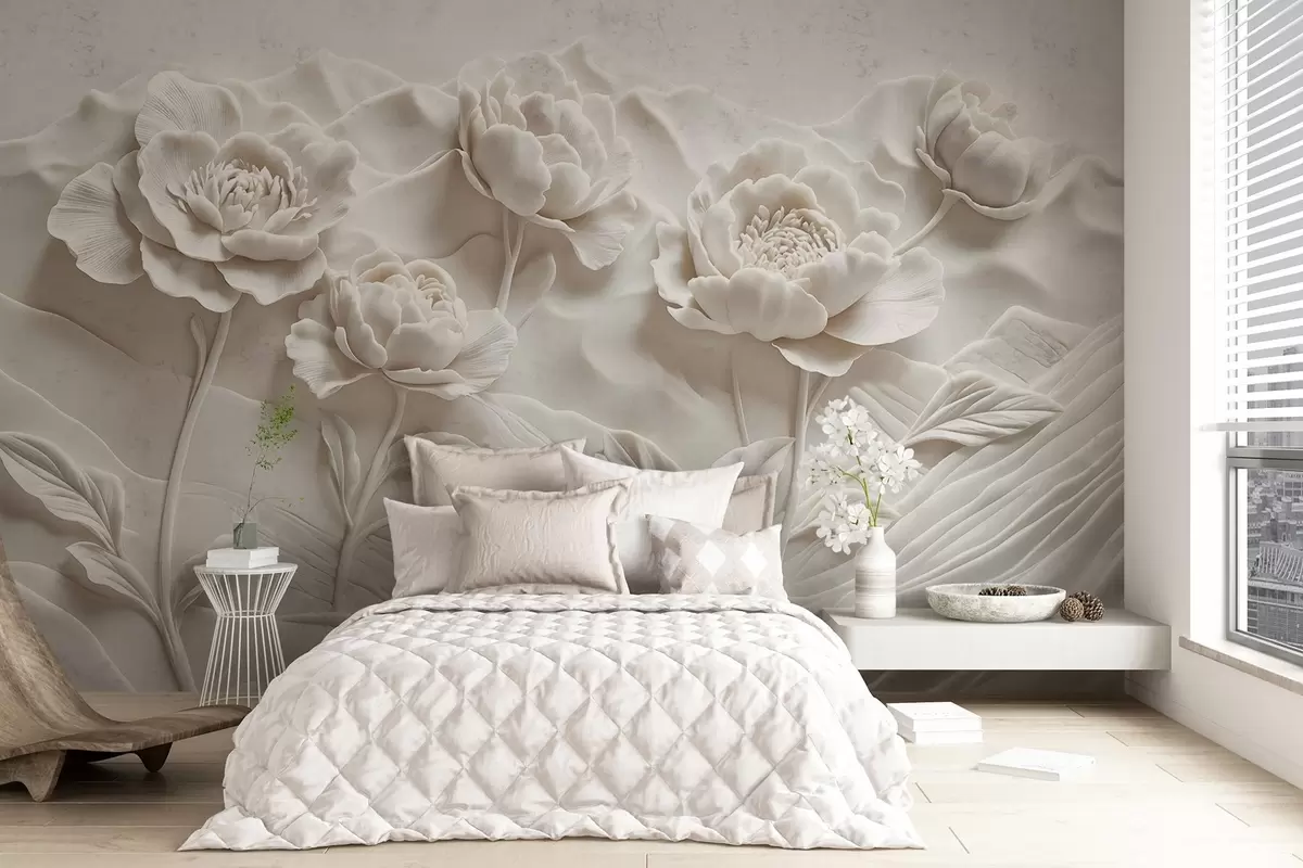 Fototapeedid Valge reljeefse skulptuuri imitatsioon, millel on suured, üksikasjalikud pioonililled tavalisel taustal Nr w08612
