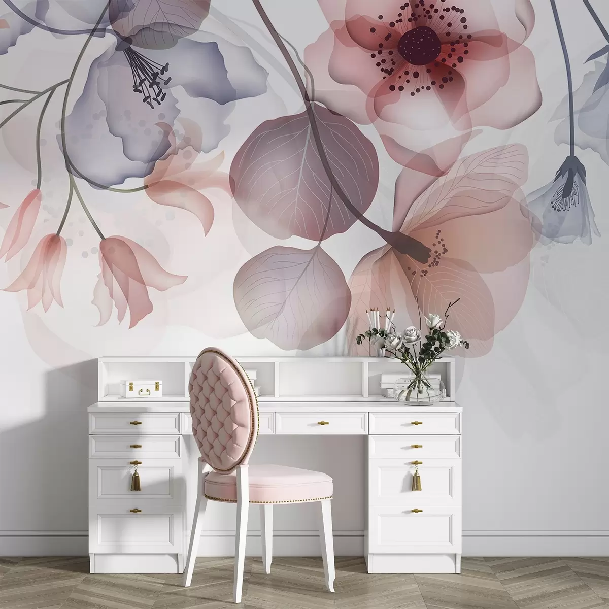 Fototapeedid Õrnad roosa ja hallid läbipaistvad õied, pehmete kroonlehtedega ja tumeda keskusega, heledal taustal Nr w08613