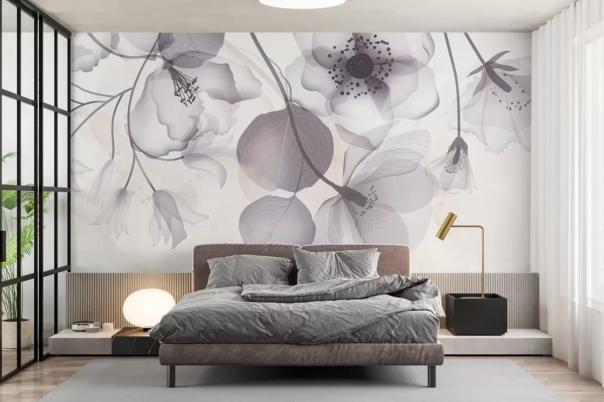 Fototapeedid Õrnad hallid ja beežid läbipaistvad õied, pehmete kroonlehtedega ja tumeda keskusega, heledal taustal Nr w08613v2