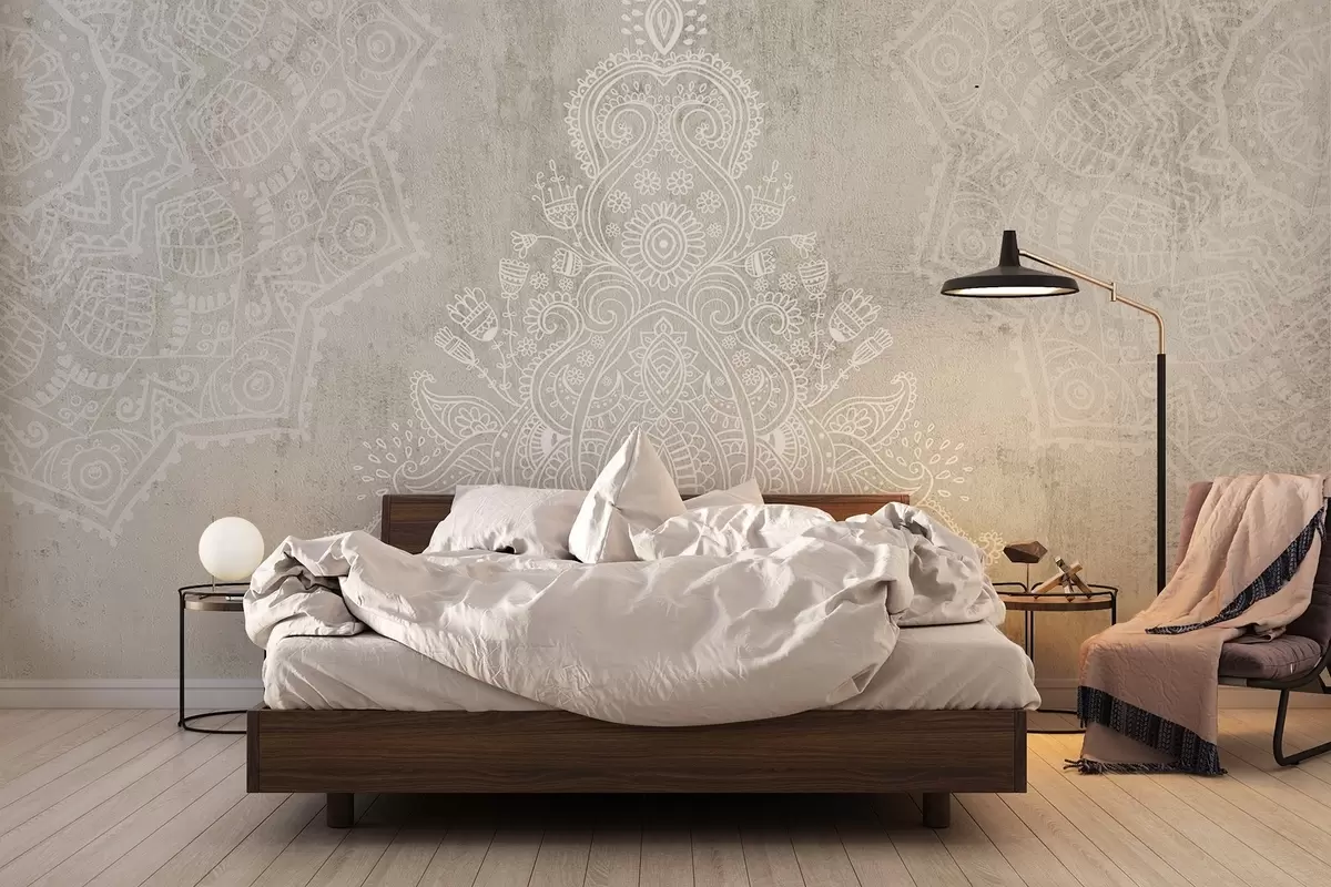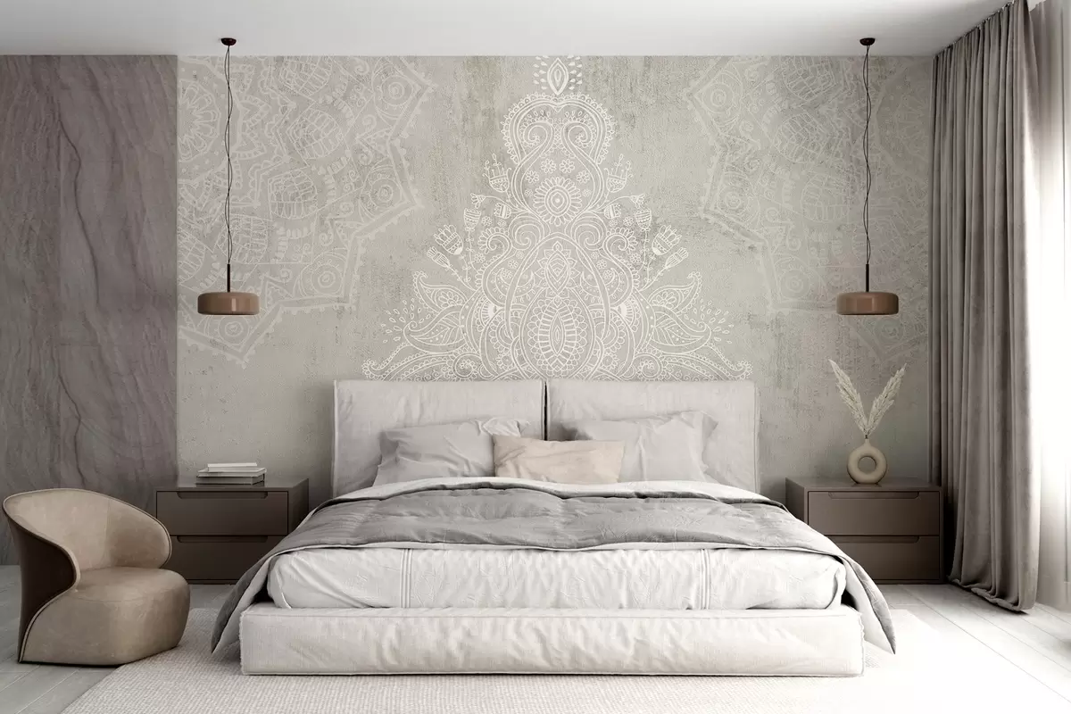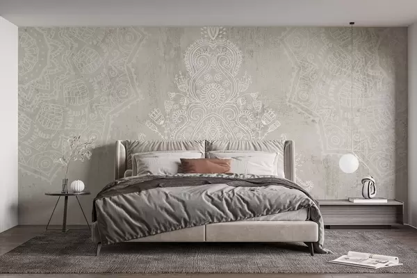 Fototapeedid Üksikasjalik, keerukas valge pitsmandalaprint helebeežil abstraktsel taustal Nr w08614