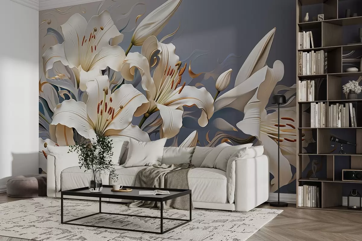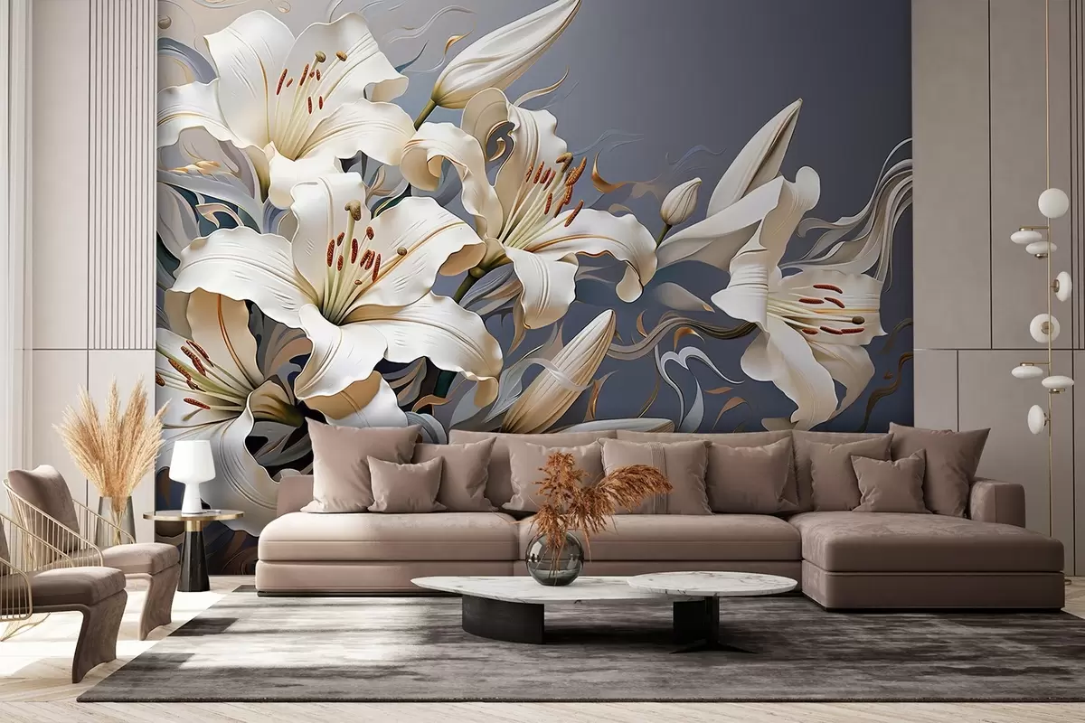 Fototapeedid Keerukad valged liiliad hallikas-sinisel taustal Nr w08633