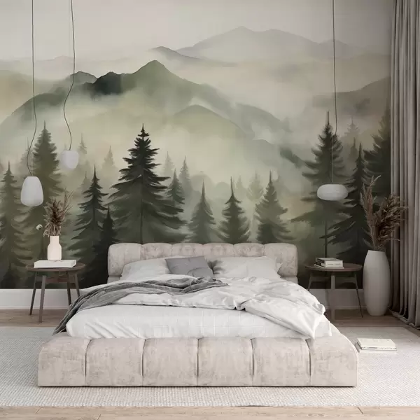 Fototapeedid Mägimaastik koos mändide metsa ja kihiline mäed ajal koidu kerge udu akvarell imitatsiooni kunsti Nr w08639