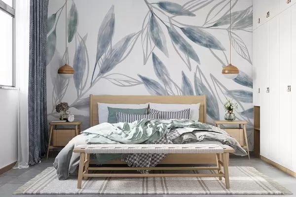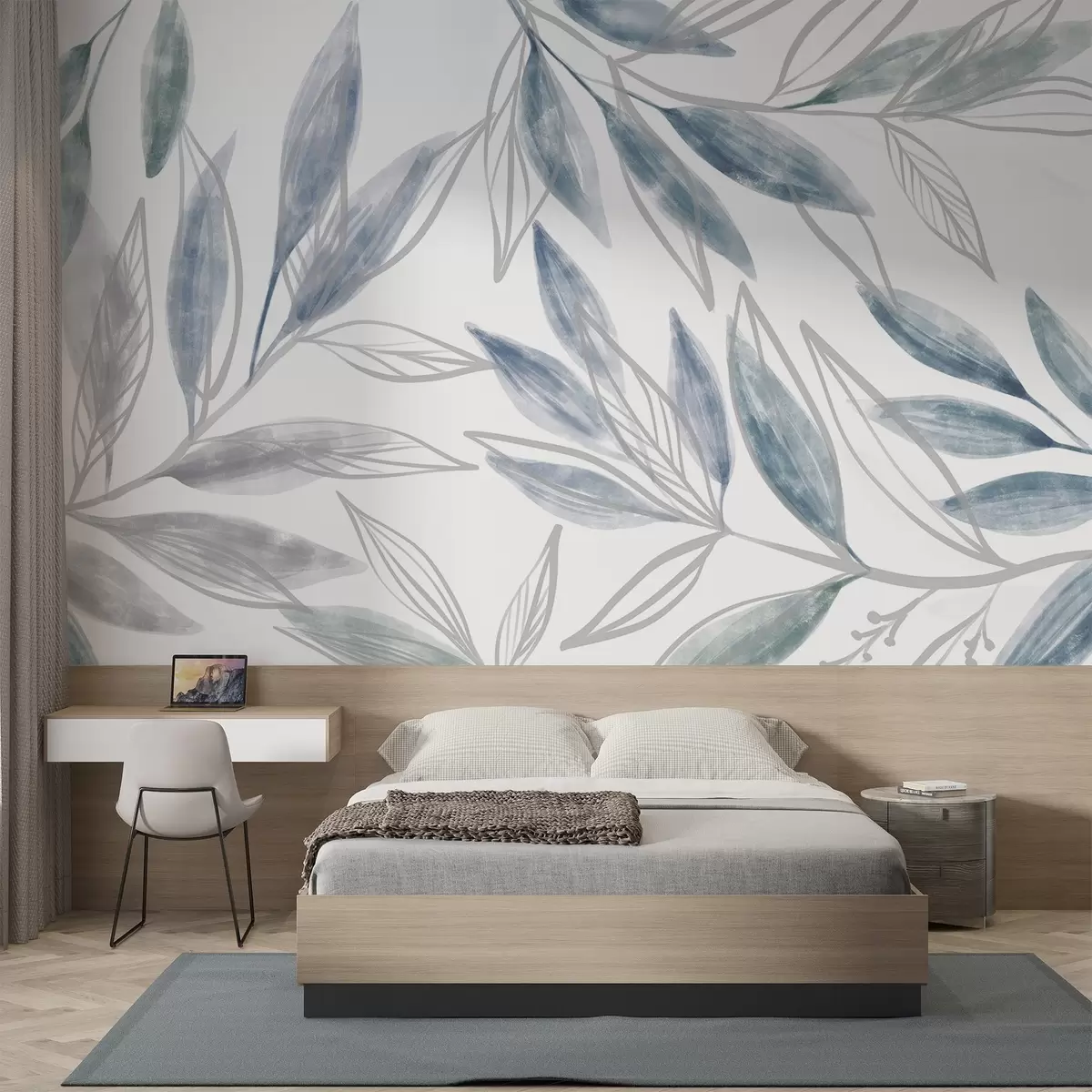 Fototapeedid Õrnad sinise ja halli tekstuuriga pastelsed lehed , mis loovad rahulikku ja minimalistlikku botaanilist kompositsiooni Nr w08642v1