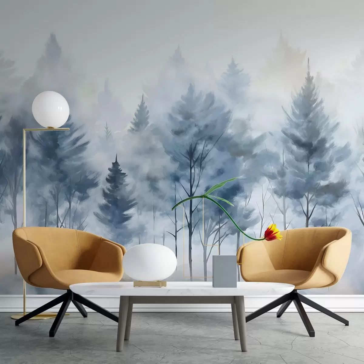 Fototapeedid Udune metsamaastik kõrgete mändide ja paljaste lehtpuudega esiplaanil akvarelli jäljenduskunstiga Nr w08643