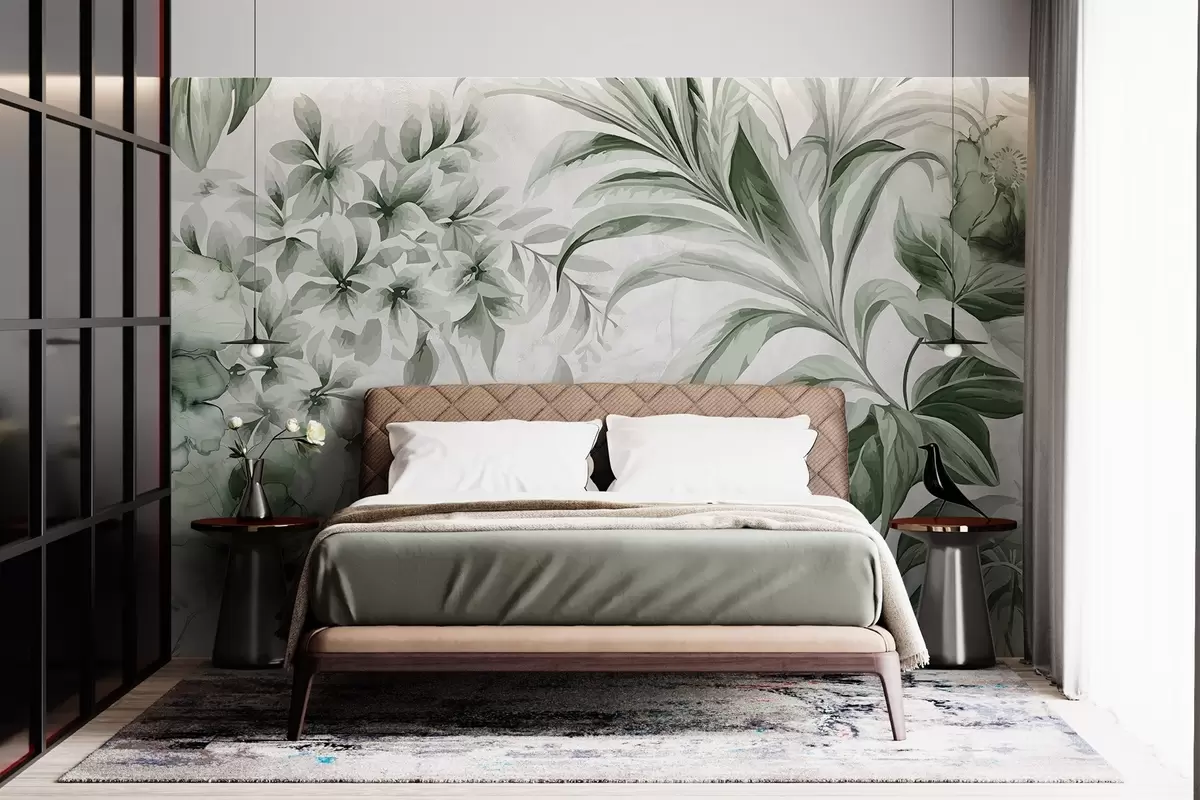 Fototapeedid Troopilised lehed ja lehestik vaoshoitud värvipaletis heledast kuni tumedate roheliste toonideni heledal taustal Nr w08650