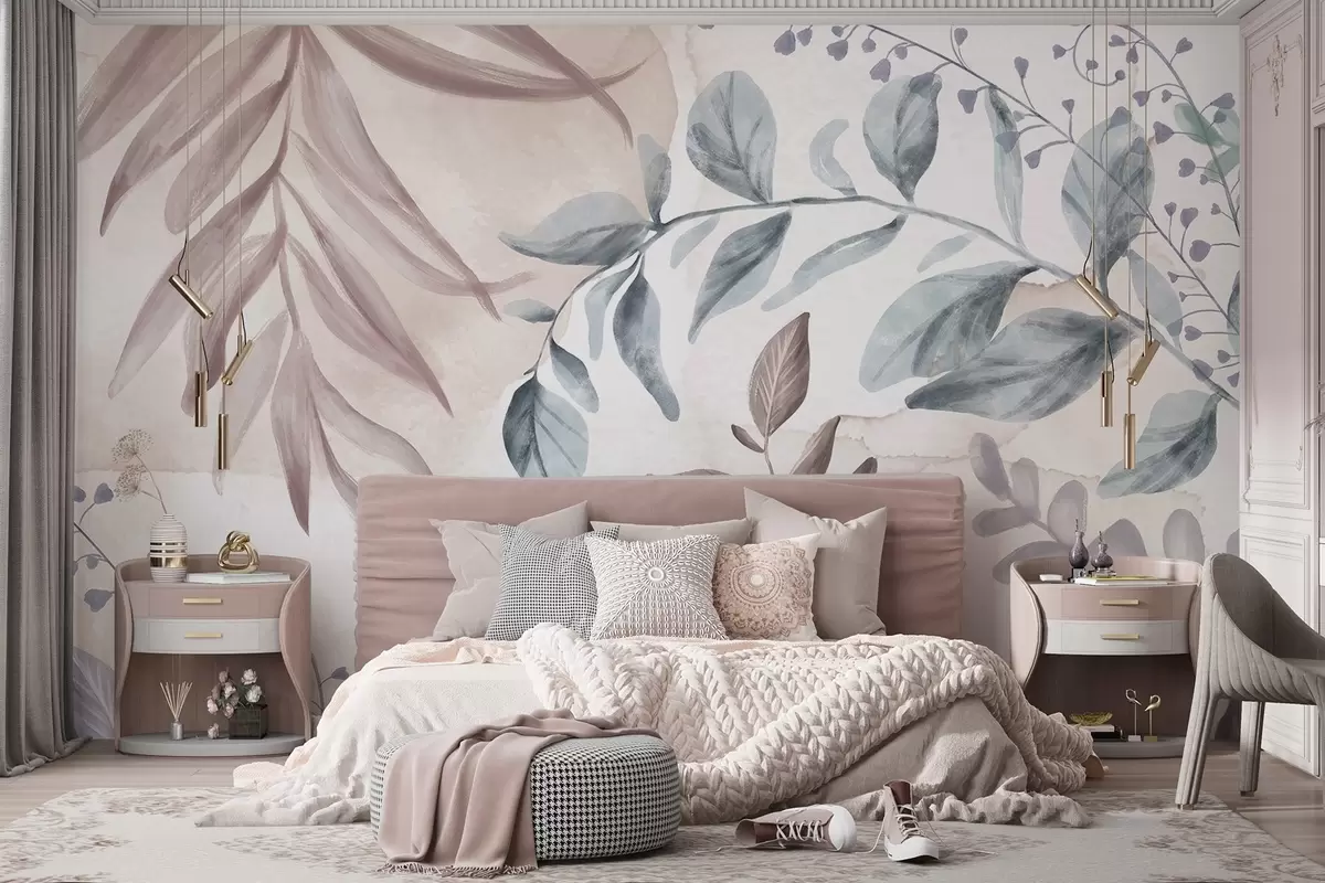 Fototapeedid Botaaniline trükis lehtede ja lilleokstega pehmete pastelsete värvidega, akvarellilaadsel taustal Nr w08668