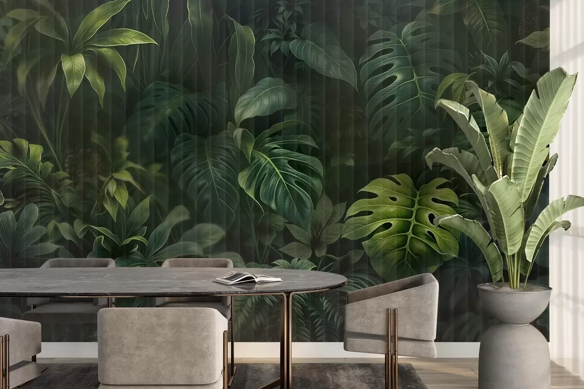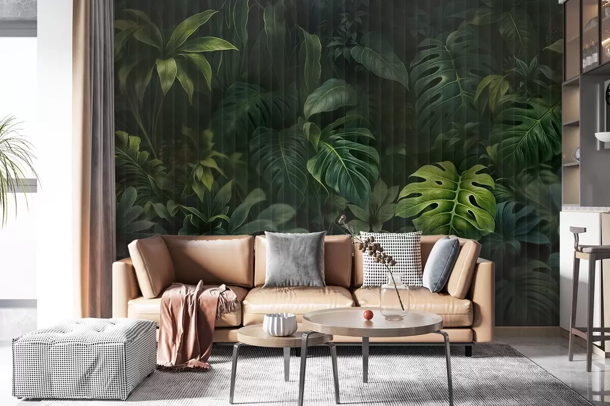 Fototapeedid Troopiline tumedat värvi hägune ja tekstuurne trükis erinevate roheliste lehtedega, sealhulgas monstera ja palmilehtedega Nr w08673