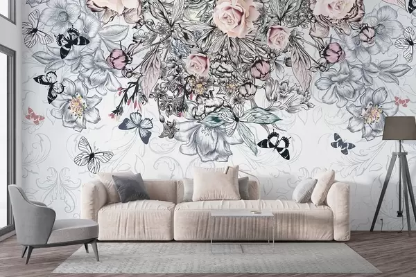 Fototapeedid Roosade roosade ja erinevate lillede ja liblikatega lilleline joonistus keerulise joonekunstiga tekstuurilisel taustal Nr w08674