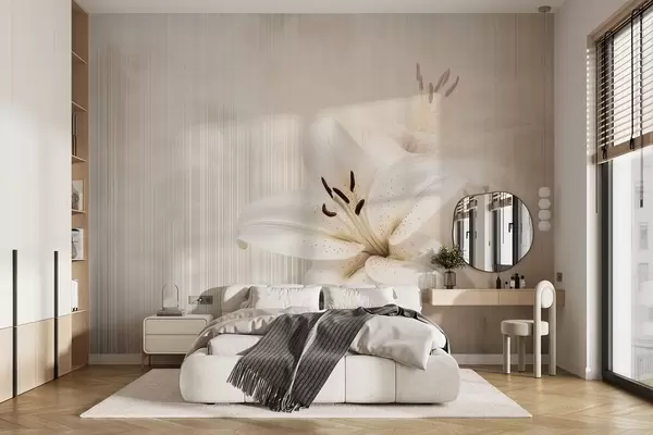 Fototapeedid Õrnad beežid liiliad vertikaalsete triipude taustal Nr w08676