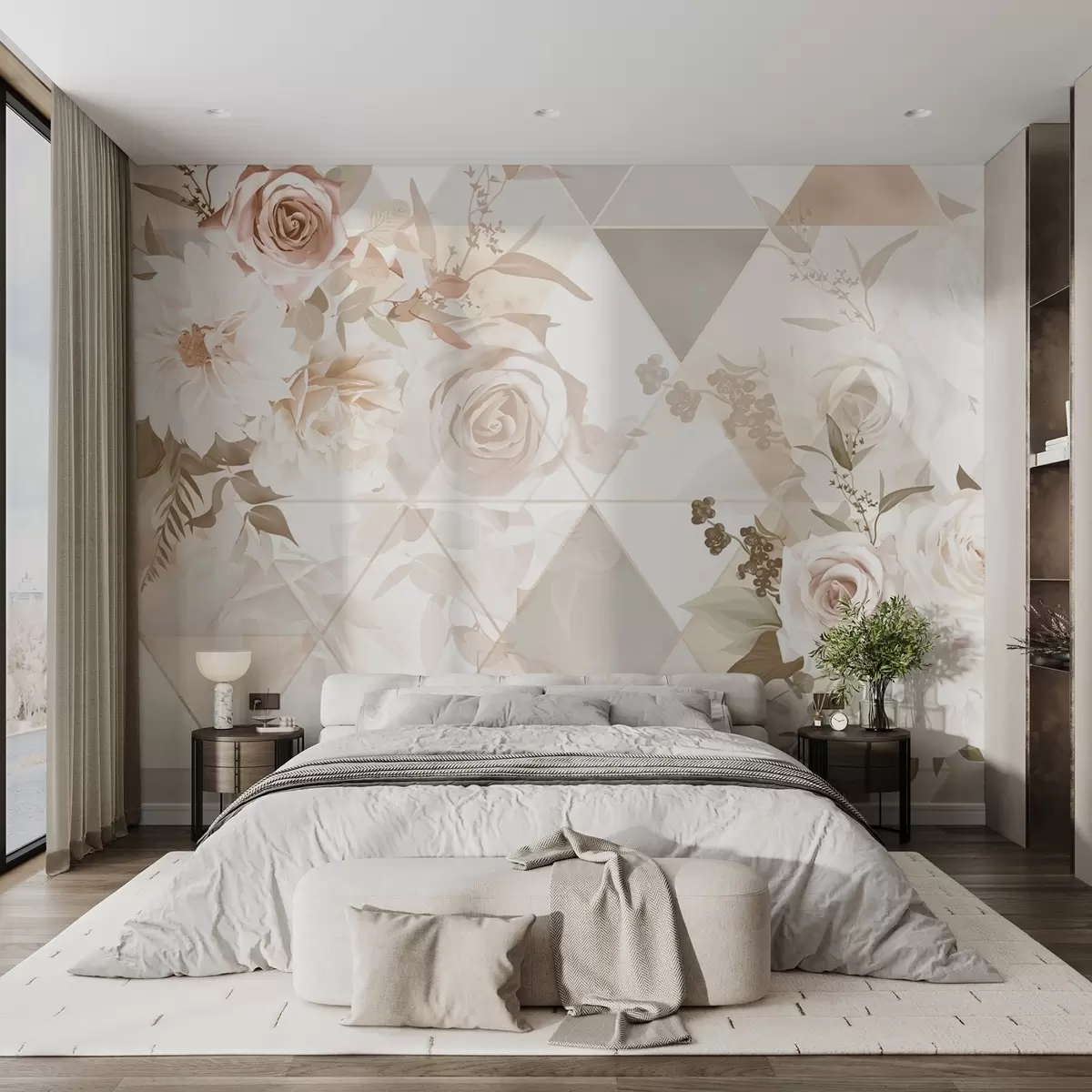 Fototapeedid Rooside ja pojengide kimbud mustrilise taustaga heledates beežides toonides Nr w08679