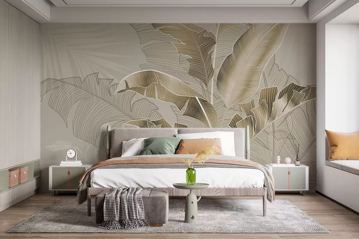 Fototapeedid Harmooniline kompositsioon troopilistest lehtedest beeži ja pruuni toonides, millel on üksikasjalik joontehnika w08698