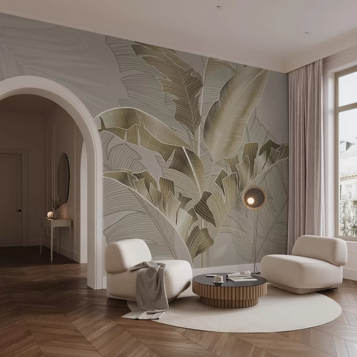 Fototapeedid Harmooniline kompositsioon troopilistest lehtedest beeži ja pruuni toonides, millel on üksikasjalik joontehnika Nr w08698