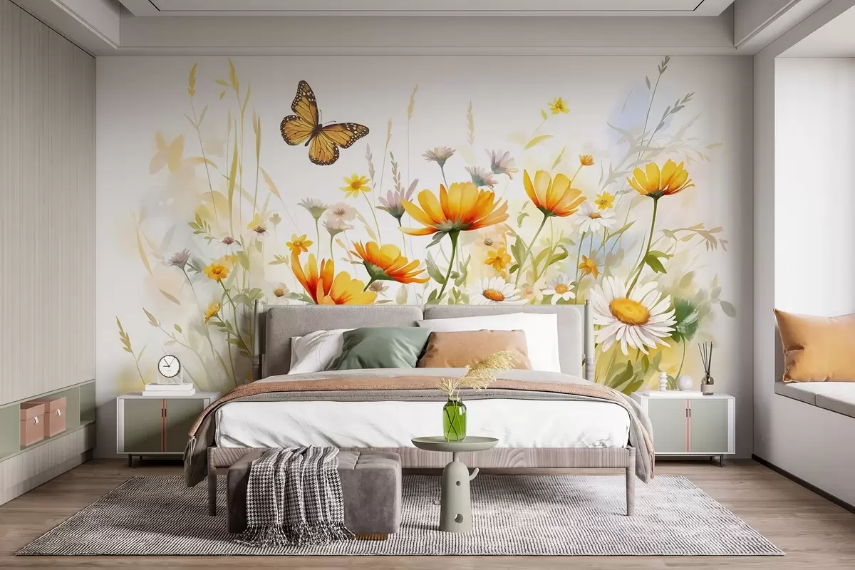 Fototapeedid Elavat akvarellilaadset lillevälja, millel on oranžid ja kollased õied koos liblikaga lillede kohal Nr w08739