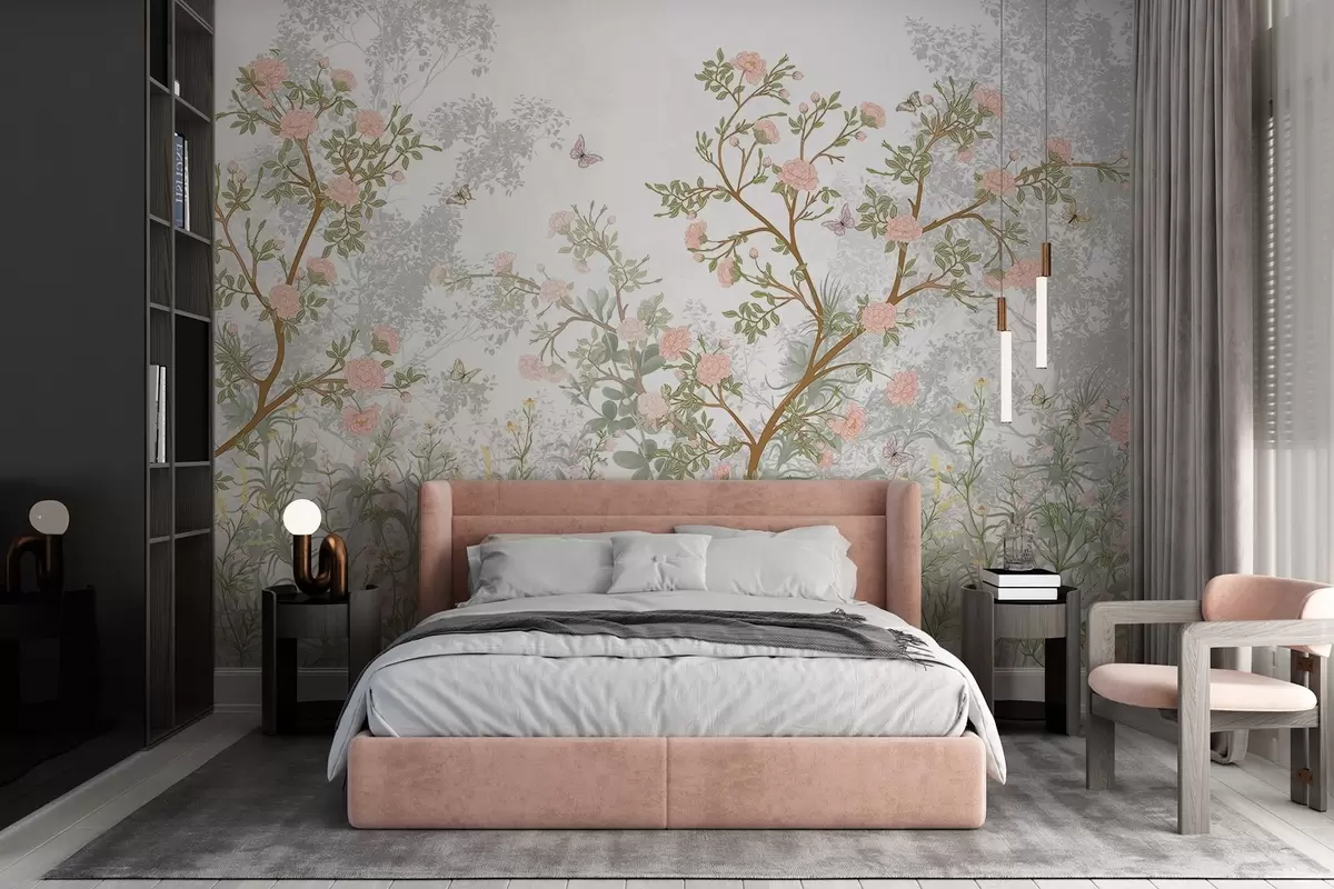Fototapeedid Õrnad roosad õitsevad puud, lendavad liblikad ja rohelised lehed, mis on põimitud sihvakate okstega Nr w08744