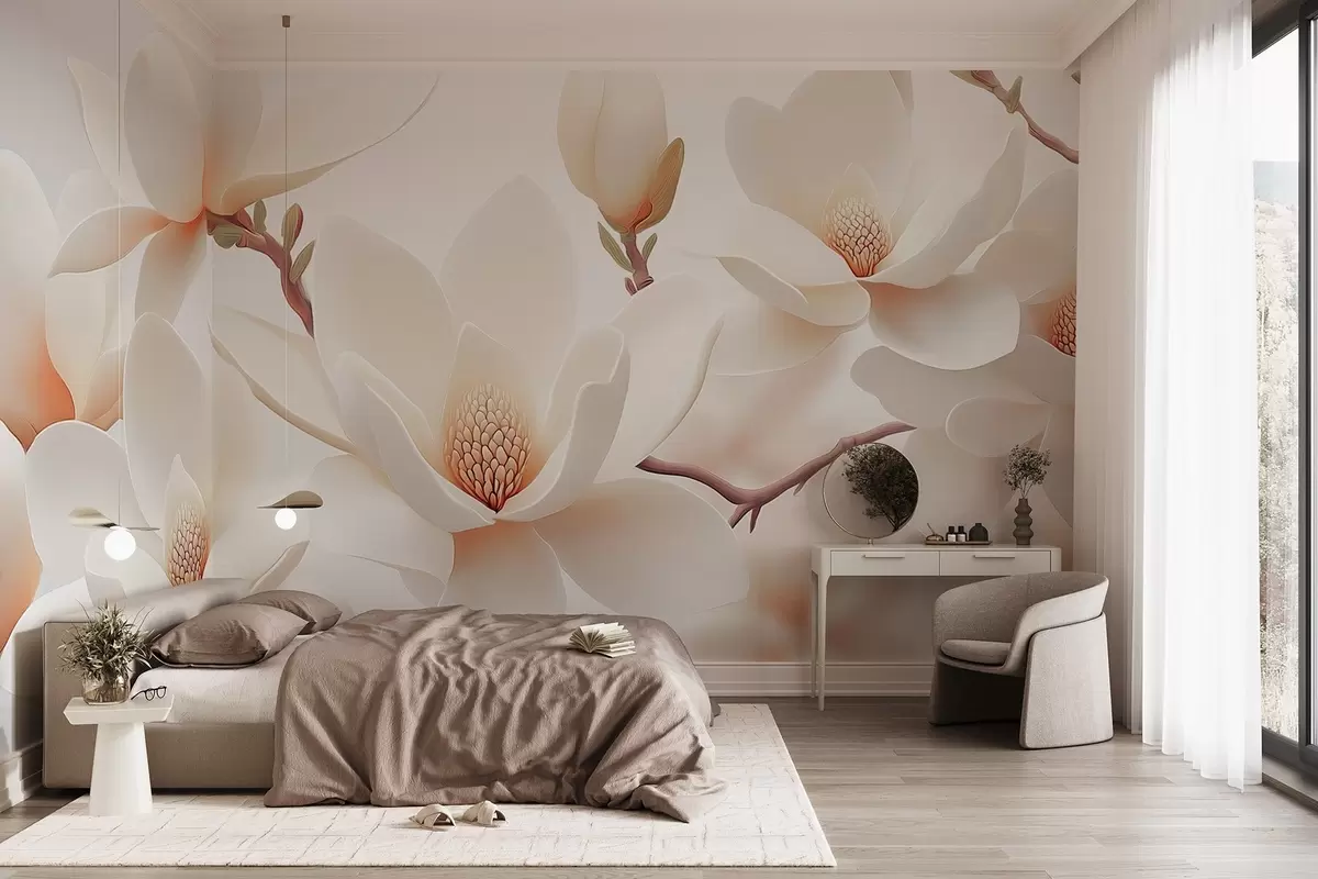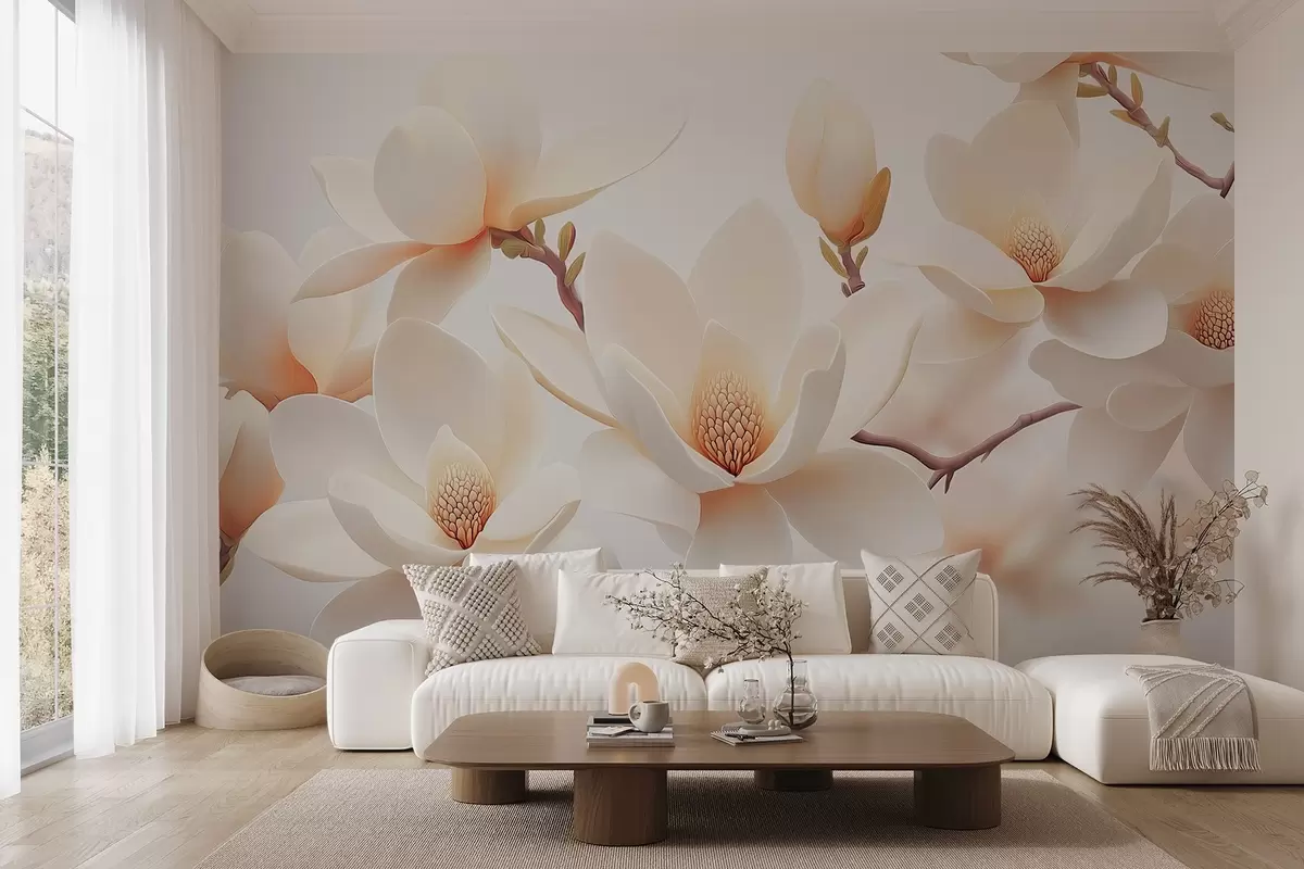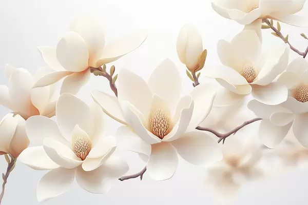 Fototapeedid Õitsevad kreemjas värvilised magnoolia lilled valgel taustal Nr w08745