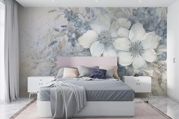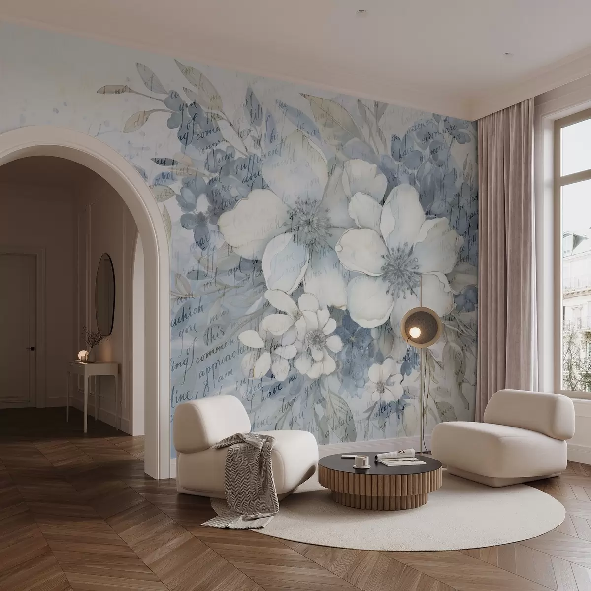 Fototapeedid Pehme seinaimitatsioon tekstuuriga valged ja sinised lilled, kahvatul taustal nõrga käsitsi kirjutatud tekstiga Nr w08771