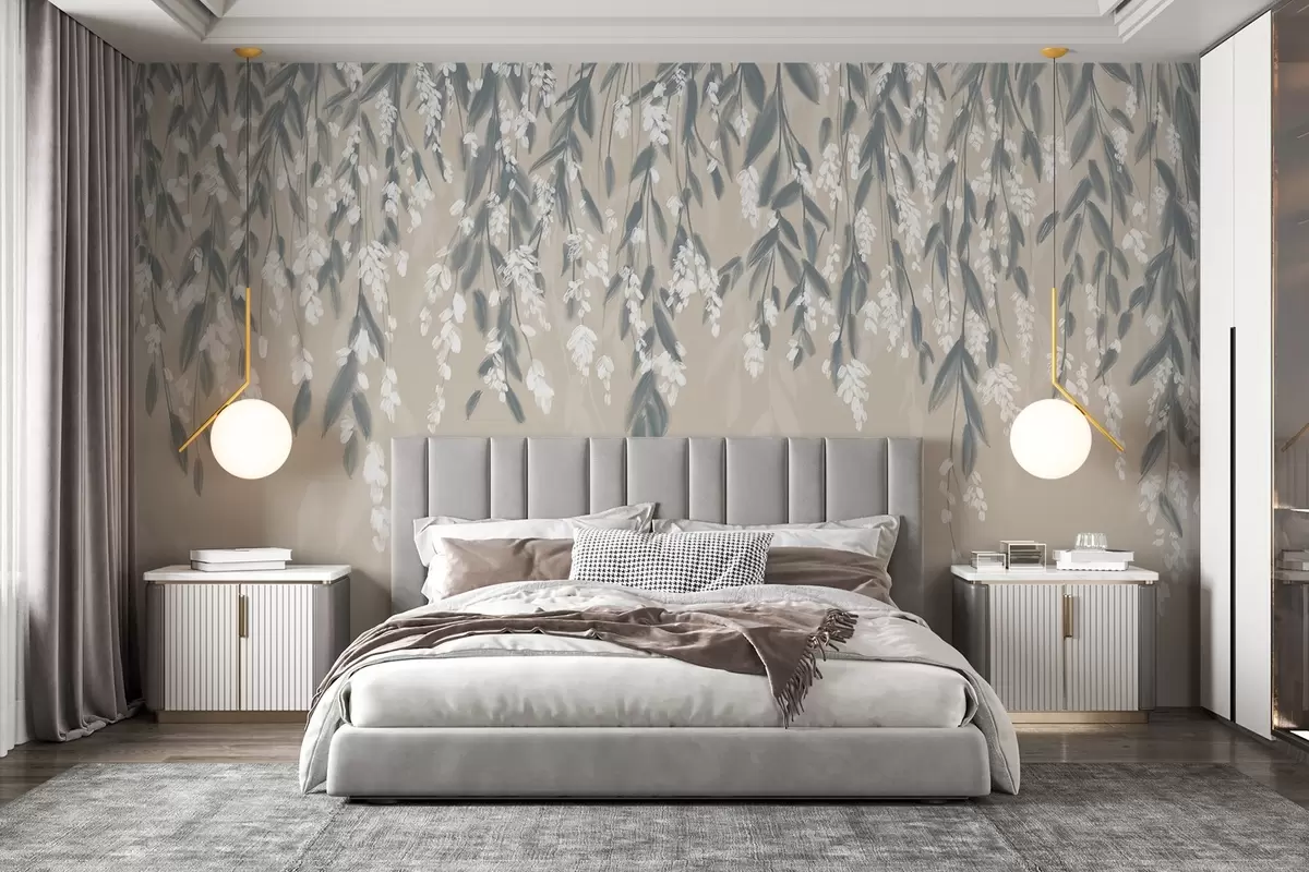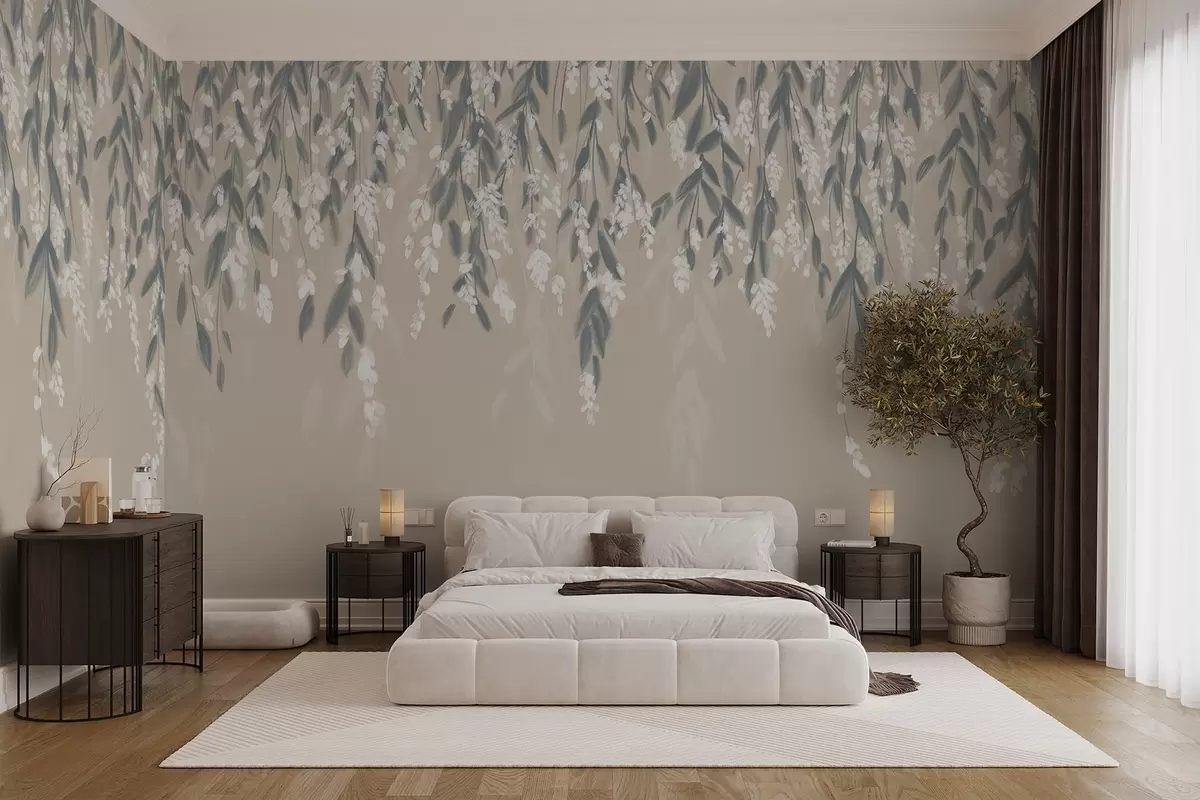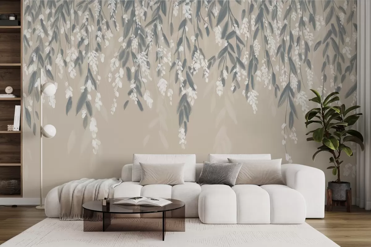 Fototapeedid Kaskadina kulgevad leheoksad varjundiga rohelised, valged lilled ja lehed beežil taustal Nr w08781