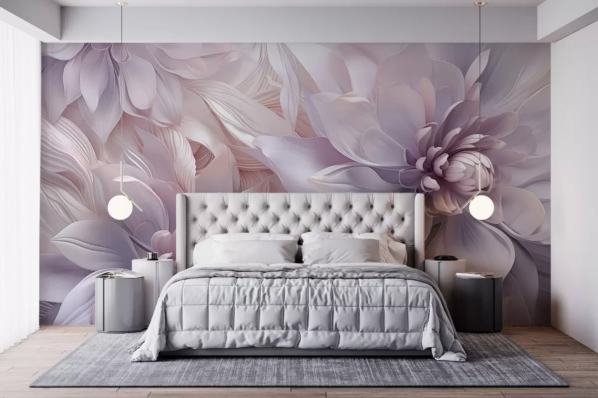 Fototapeedid Pehmed, kihilised lilled kahvaturoosa, lavendli ja valge varjundiga, õrnade kroonlehtede ja keeruliste detailidega Nr w08783