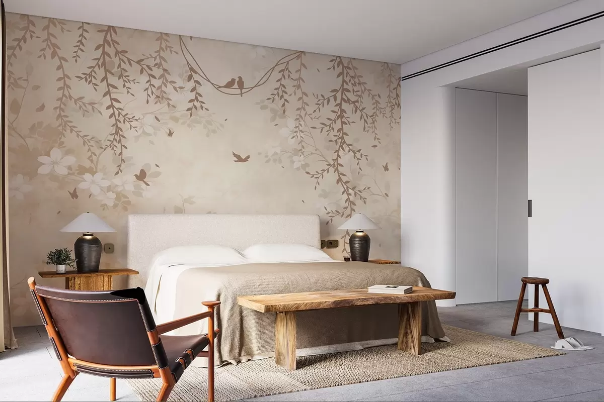 Fototapeedid Linnud koos rippuvate taimede ja lillemustriga heledates beeži-kreemi toonides Nr w08809