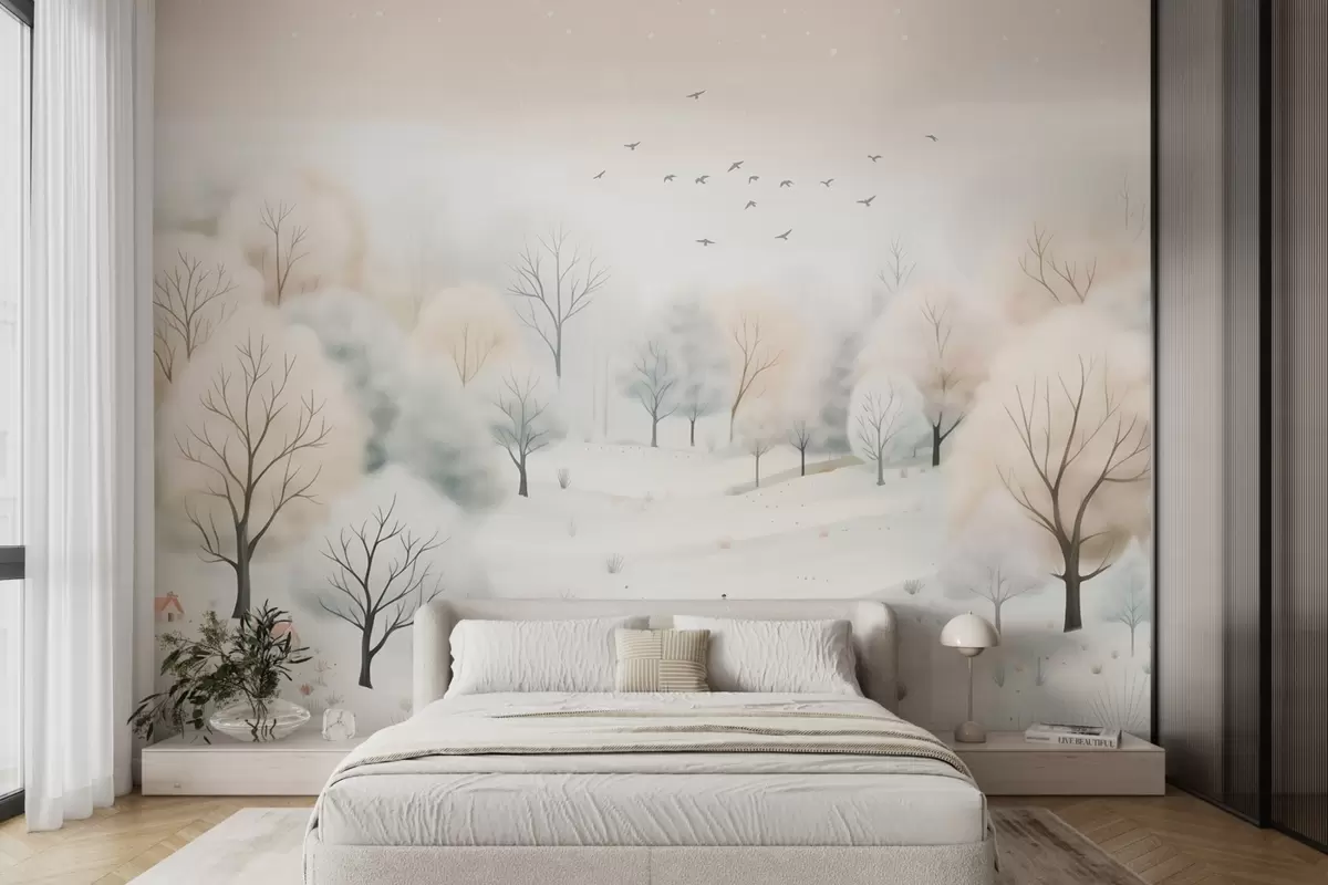 Fototapeedid Talvine mets koos puude, väikeste majade, lindude ja lumega kerge akvarellistiilis Nr w08815