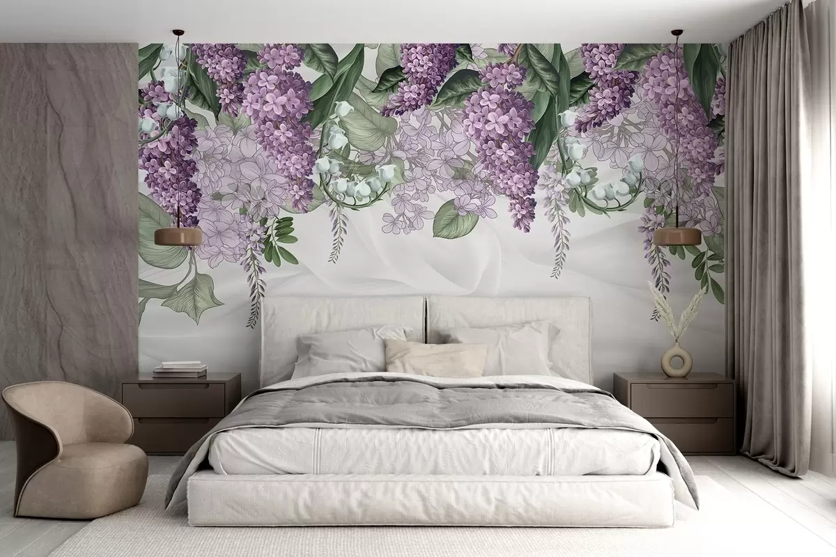Fototapeedid Pastelllillad lillad ja rohelised lehed valgel taustal, siidi imitatsiooniga tekstuuriga Nr w08825